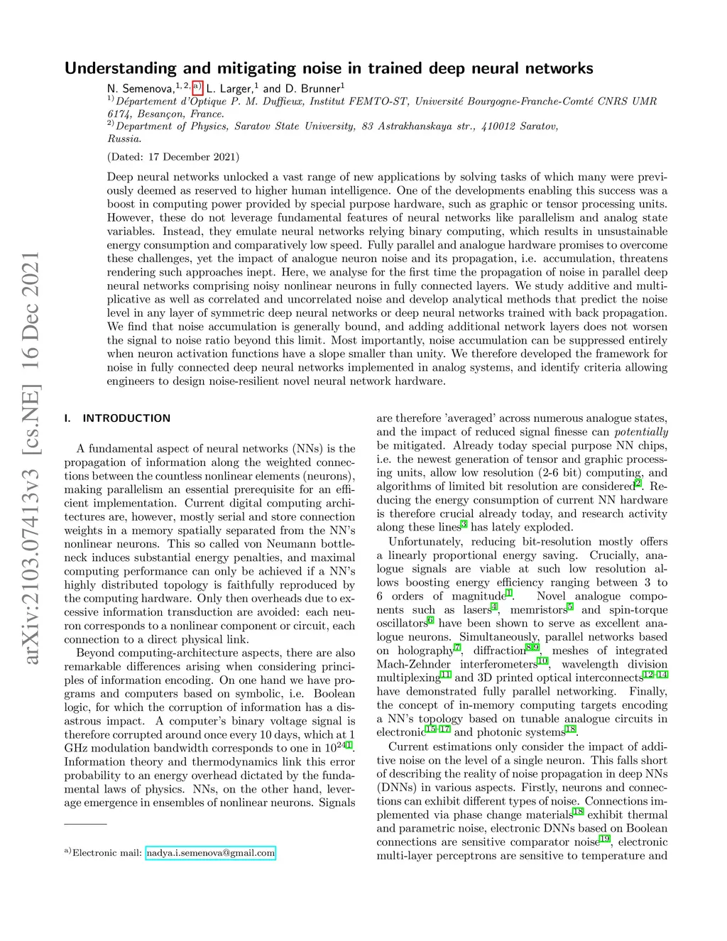 Deep neural networks unlocked a vast range of new applications by solving tasks of which many were previously deemed as reserved to higher human intelligence. One of the developments enabling this success was a boost in computing power provided by special purpose hardware, such as graphic or tensor processing units. However, these do not leverage fundamental features of neural networks like parallelism and analog state variables. Instead, they emulate neural networks relying on binary computing, which results in unsustainable energy consumption and comparatively low speed. Fully parallel and analogue hardware promises to overcome these challenges, yet the impact of analogue neuron noise and its propagation, i.e. accumulation, threatens rendering such approaches inept. Here, we determine for the first time the propagation of noise in deep neural networks comprising noisy nonlinear neurons in trained fully connected layers. We study additive and multiplicative as well as correlated and uncorrelated noise, and develop analytical methods that predict the noise level in any layer of symmetric deep neural networks or deep neural networks trained with back propagation. We find that noise accumulation is generally bound, and adding additional network layers does not worsen the signal to noise ratio beyond a limit. Most importantly, noise accumulation can be suppressed entirely when neuron activation functions have a slope smaller than unity. We therefore developed the framework for noise in fully connected deep neural networks implemented in analog systems, and identify criteria allowing engineers to design noise-resilient novel neural network hardware.