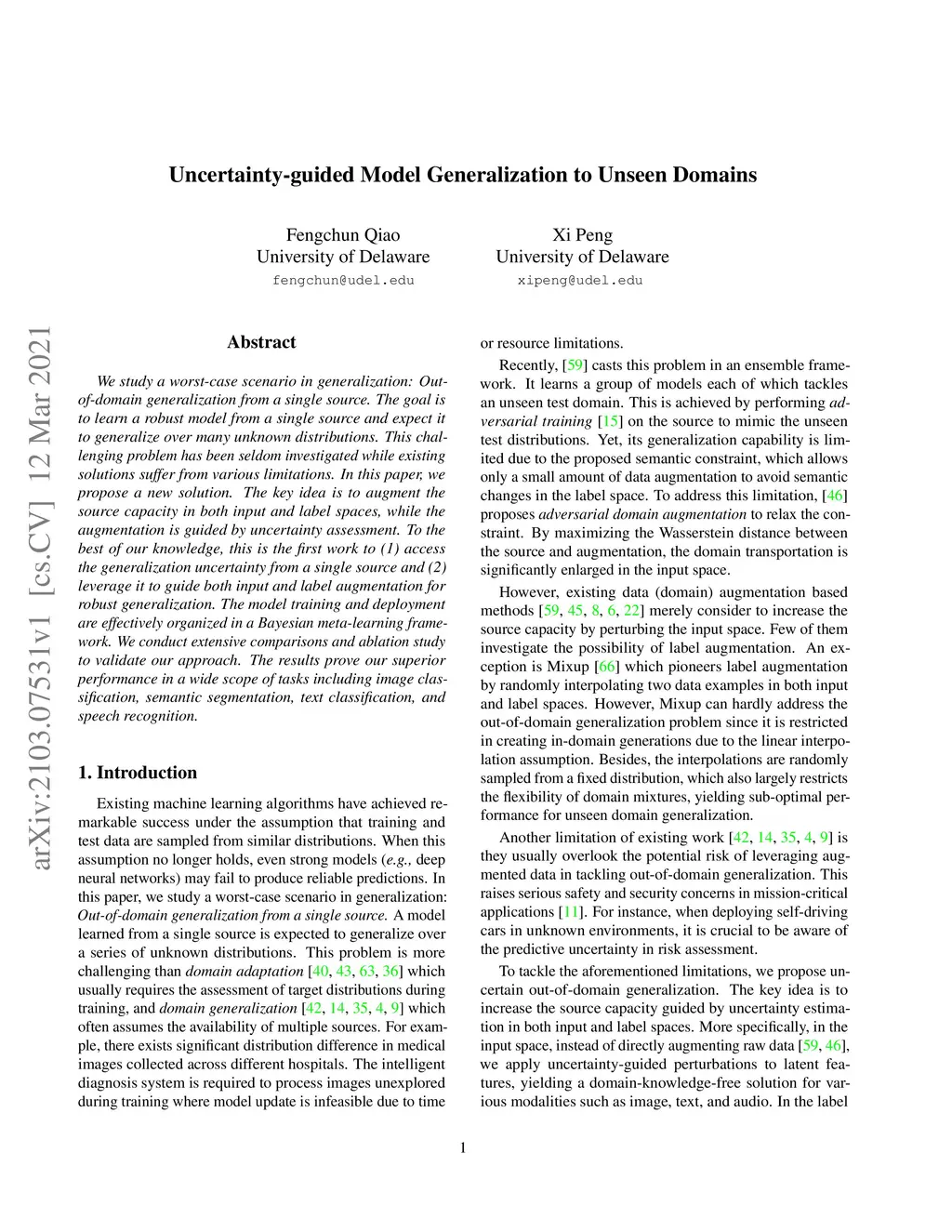 We study a worst-case scenario in generalization: Out-of-domain generalization from a single source. The goal is to learn a robust model from a single source and expect it to generalize over many unknown distributions. This challenging problem has been seldom investigated while existing solutions suffer from various limitations. In this paper, we propose a new solution. The key idea is to augment the source capacity in both input and label spaces, while the augmentation is guided by uncertainty assessment. To the best of our knowledge, this is the first work to (1) access the generalization uncertainty from a single source and (2) leverage it to guide both input and label augmentation for robust generalization. The model training and deployment are effectively organized in a Bayesian meta-learning framework. We conduct extensive comparisons and ablation study to validate our approach. The results prove our superior performance in a wide scope of tasks including image classification, semantic segmentation, text classification, and speech recognition.
