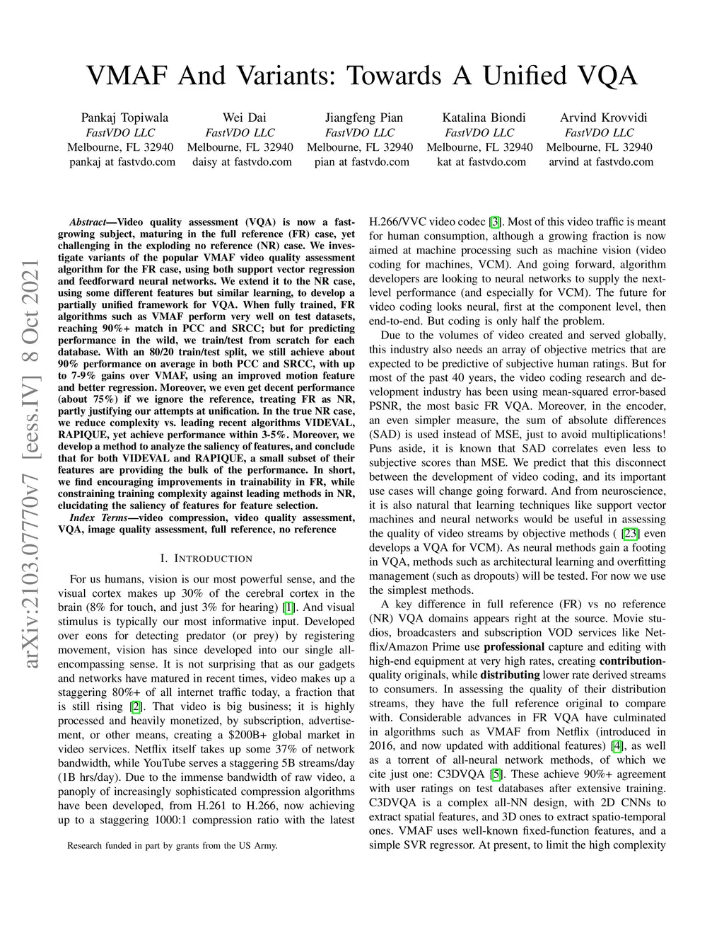 Video quality assessment (VQA) is now a fast-growing subject, maturing in the full reference (FR) case, yet challenging in the exploding no reference (NR) case. We investigate variants of the popular VMAF video quality assessment algorithm for the FR case, using both support vector regression and feedforward neural networks. We extend it to the NR case, using some different features but similar learning, to develop a partially unified framework for VQA. When fully trained, FR algorithms such as VMAF perform very well on test datasets, reaching 90%+ match in PCC and SRCC; but for predicting performance in the wild, we train/test from scratch for each database. With an 80/20 train/test split, we still achieve about 90% performance on average in both PCC and SRCC, with up to 7-9% gains over VMAF, using an improved motion feature and better regression. Moreover, we even get decent performance (about 75%) if we ignore the reference, treating FR as NR, partly justifying our attempts at unification. In the true NR case, we reduce complexity vs. leading recent algorithms VIDEVAL, RAPIQUE, yet achieve performance within 3-5%. Moreover, we develop a method to analyze the saliency of features, and conclude that for both VIDEVAL and RAPIQUE, a small subset of their features are providing the bulk of the performance. In short, we find encouraging improvements in trainability in FR, while constraining training complexity against leading methods in NR, elucidating the saliency of features for feature selection.