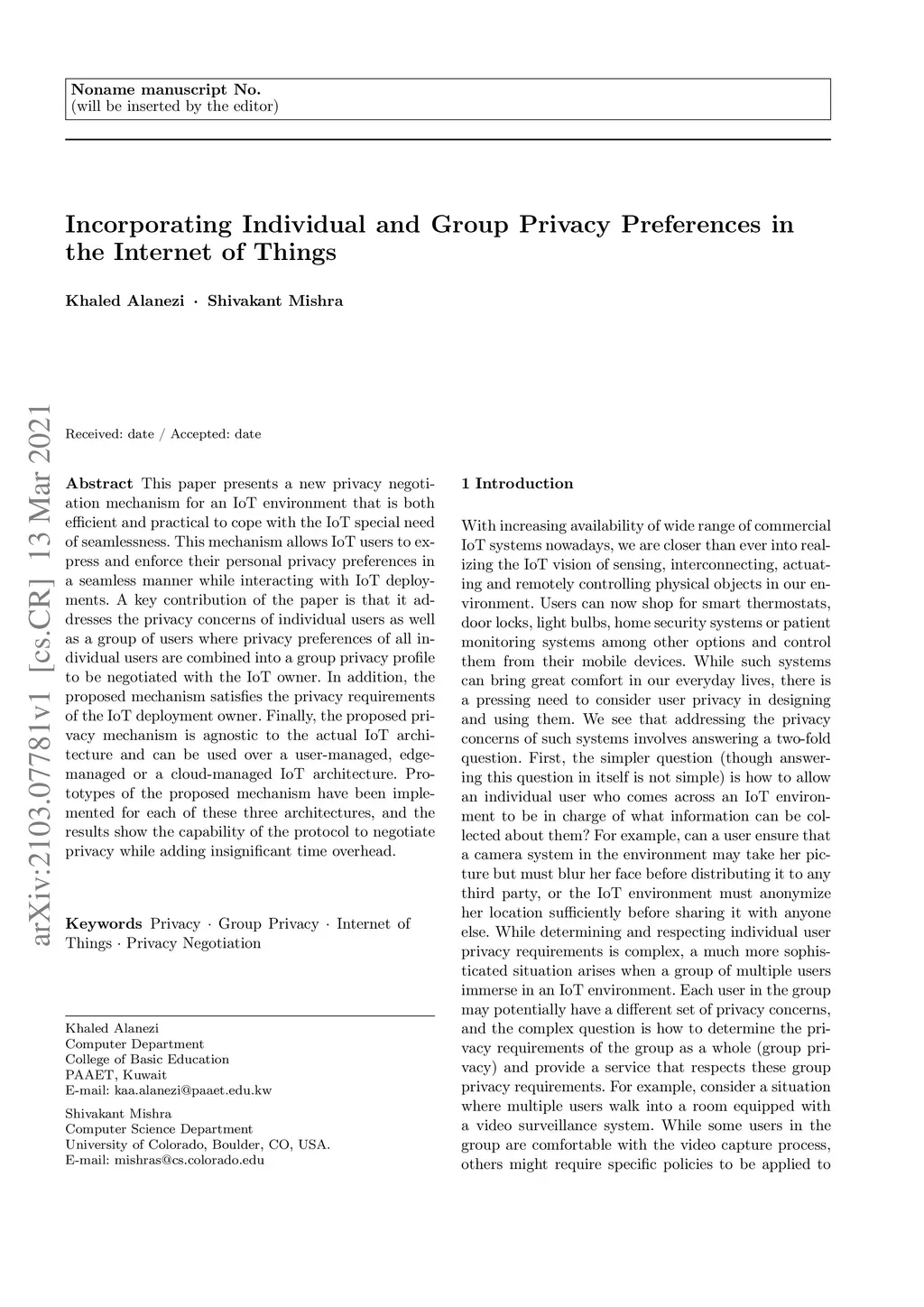 This paper presents a new privacy negotiation mechanism for an IoT environment that is both efficient and practical to cope with the IoT special need of seamlessness. This mechanism allows IoT users to express and enforce their personal privacy preferences in a seamless manner while interacting with IoT deployments. A key contribution of the paper is that it addresses the privacy concerns of individual users as well as a group of users where privacy preferences of all individual users are combined into a group privacy profile to be negotiated with the IoT owner. In addition, the proposed mechanism satisfies the privacy requirements of the IoT deployment owner. Finally, the proposed privacy mechanism is agnostic to the actual IoT architecture and can be used over a user-managed, edge-managed or a cloud-managed IoT architecture. Prototypes of the proposed mechanism have been implemented for each of these three architectures, and the results show the capability of the protocol to negotiate privacy while adding insignificant time overhead.