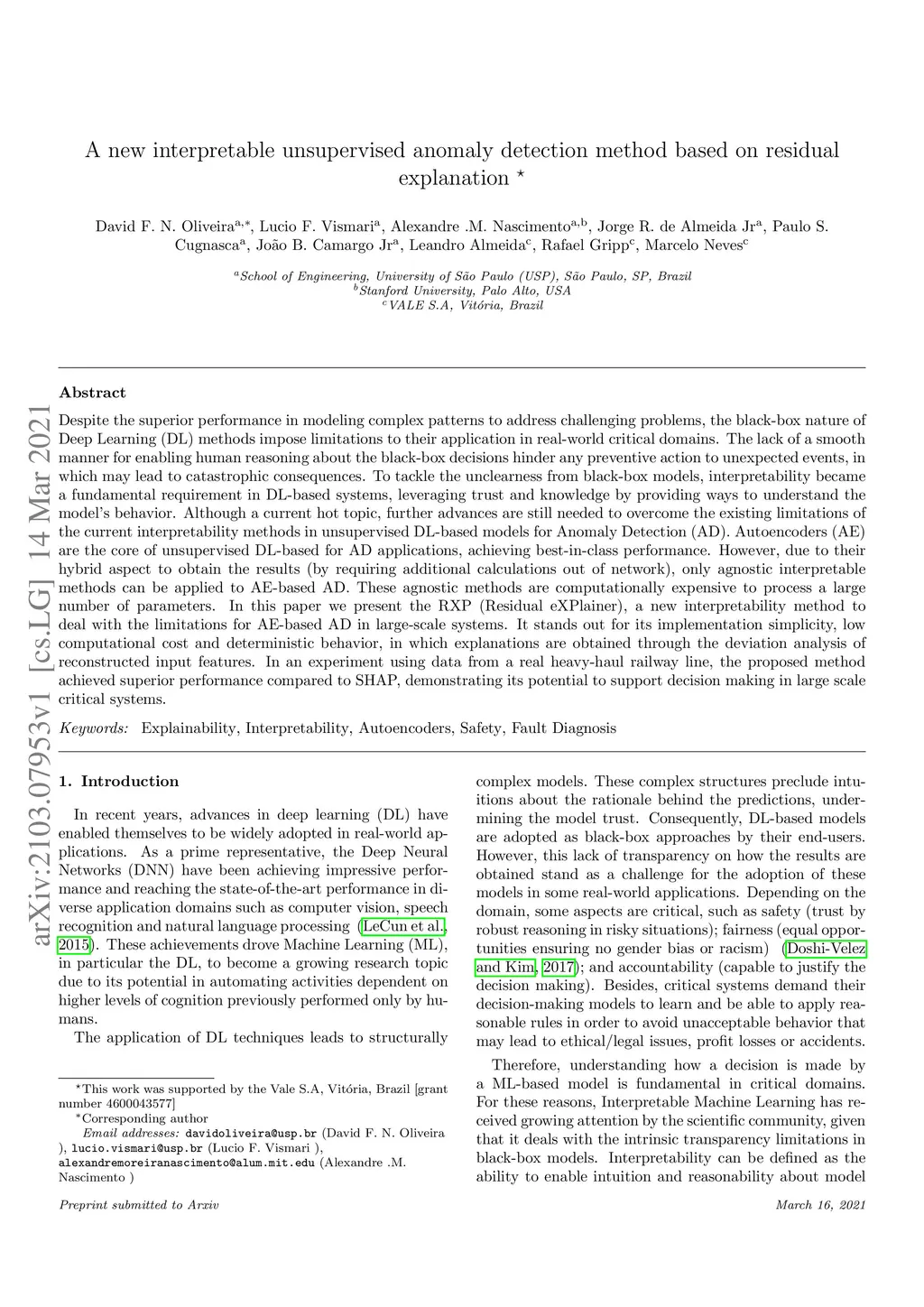 Despite the superior performance in modeling complex patterns to address challenging problems, the black-box nature of Deep Learning (DL) methods impose limitations to their application in real-world critical domains. The lack of a smooth manner for enabling human reasoning about the black-box decisions hinder any preventive action to unexpected events, in which may lead to catastrophic consequences. To tackle the unclearness from black-box models, interpretability became a fundamental requirement in DL-based systems, leveraging trust and knowledge by providing ways to understand the model's behavior. Although a current hot topic, further advances are still needed to overcome the existing limitations of the current interpretability methods in unsupervised DL-based models for Anomaly Detection (AD). Autoencoders (AE) are the core of unsupervised DL-based for AD applications, achieving best-in-class performance. However, due to their hybrid aspect to obtain the results (by requiring additional calculations out of network), only agnostic interpretable methods can be applied to AE-based AD. These agnostic methods are computationally expensive to process a large number of parameters. In this paper we present the RXP (Residual eXPlainer), a new interpretability method to deal with the limitations for AE-based AD in large-scale systems. It stands out for its implementation simplicity, low computational cost and deterministic behavior, in which explanations are obtained through the deviation analysis of reconstructed input features. In an experiment using data from a real heavy-haul railway line, the proposed method achieved superior performance compared to SHAP, demonstrating its potential to support decision making in large scale critical systems.