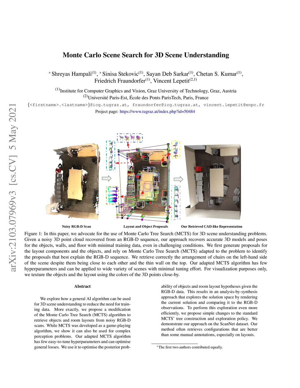 We explore how a general AI algorithm can be used for 3D scene understanding to reduce the need for training data. More exactly, we propose a modification of the Monte Carlo Tree Search (MCTS) algorithm to retrieve objects and room layouts from noisy RGB-D scans. While MCTS was developed as a game-playing algorithm, we show it can also be used for complex perception problems. Our adapted MCTS algorithm has few easy-to-tune hyperparameters and can optimise general losses. We use it to optimise the posterior probability of objects and room layout hypotheses given the RGB-D data. This results in an analysis-by-synthesis approach that explores the solution space by rendering the current solution and comparing it to the RGB-D observations. To perform this exploration even more efficiently, we propose simple changes to the standard MCTS' tree construction and exploration policy. We demonstrate our approach on the ScanNet dataset. Our method often retrieves configurations that are better than some manual annotations, especially on layouts.