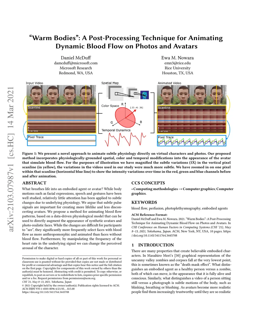 What breathes life into an embodied agent or avatar? While body motions such as facial expressions, speech and gestures have been well studied, relatively little attention has been applied to subtle changes due to underlying physiology. We argue that subtle pulse signals are important for creating more lifelike and less disconcerting avatars. We propose a method for animating blood flow patterns, based on a data-driven physiological model that can be used to directly augment the appearance of synthetic avatars and photo-realistic faces. While the changes are difficult for participants to "see", they significantly more frequently select faces with blood flow as more anthropomorphic and animated than faces without blood flow. Furthermore, by manipulating the frequency of the heart rate in the underlying signal we can change the perceived arousal of the character.