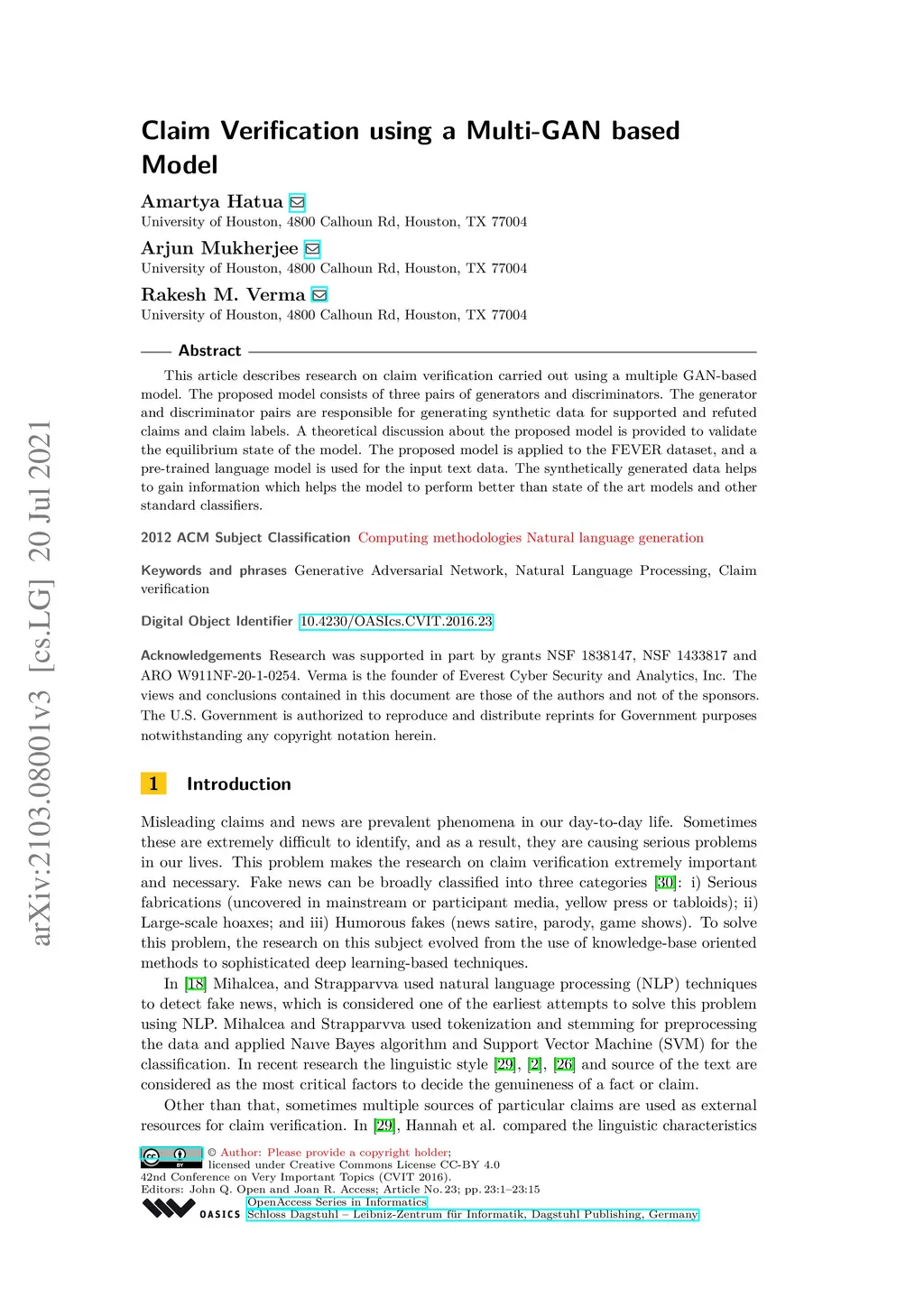 This article describes research on claim verification carried out using a multiple GAN-based model. The proposed model consists of three pairs of generators and discriminators. The generator and discriminator pairs are responsible for generating synthetic data for supported and refuted claims and claim labels. A theoretical discussion about the proposed model is provided to validate the equilibrium state of the model. The proposed model is applied to the FEVER dataset, and a pre-trained language model is used for the input text data. The synthetically generated data helps to gain information which helps the model to perform better than state of the art models and other standard classifiers.