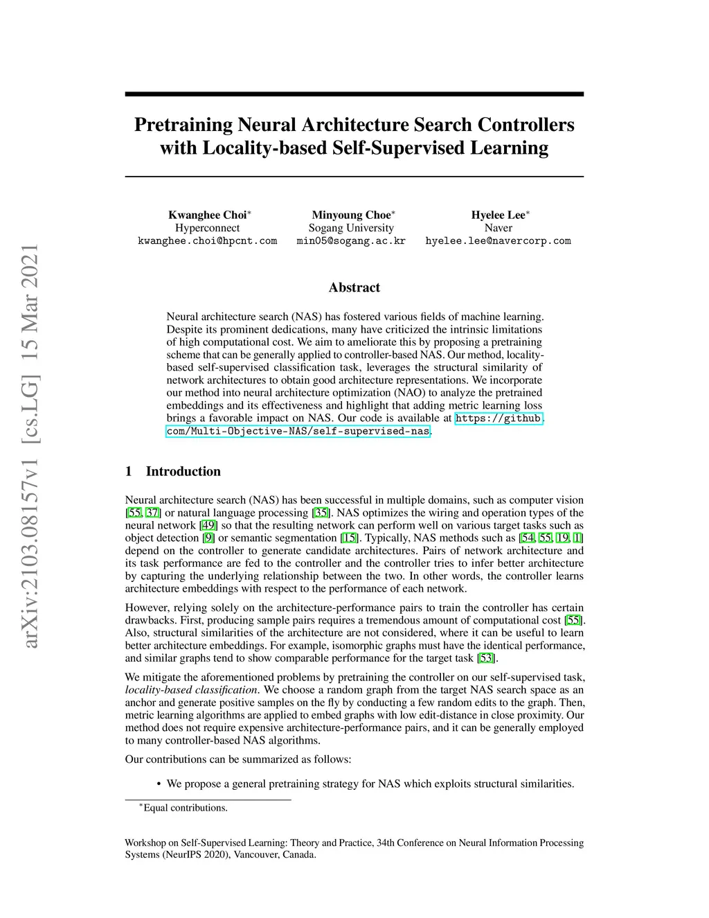Neural architecture search (NAS) has fostered various fields of machine learning. Despite its prominent dedications, many have criticized the intrinsic limitations of high computational cost. We aim to ameliorate this by proposing a pretraining scheme that can be generally applied to controller-based NAS. Our method, locality-based self-supervised classification task, leverages the structural similarity of network architectures to obtain good architecture representations. We incorporate our method into neural architecture optimization (NAO) to analyze the pretrained embeddings and its effectiveness and highlight that adding metric learning loss brings a favorable impact on NAS. Our code is available at \url{https://github.com/Multi-Objective-NAS/self-supervised-nas}.
