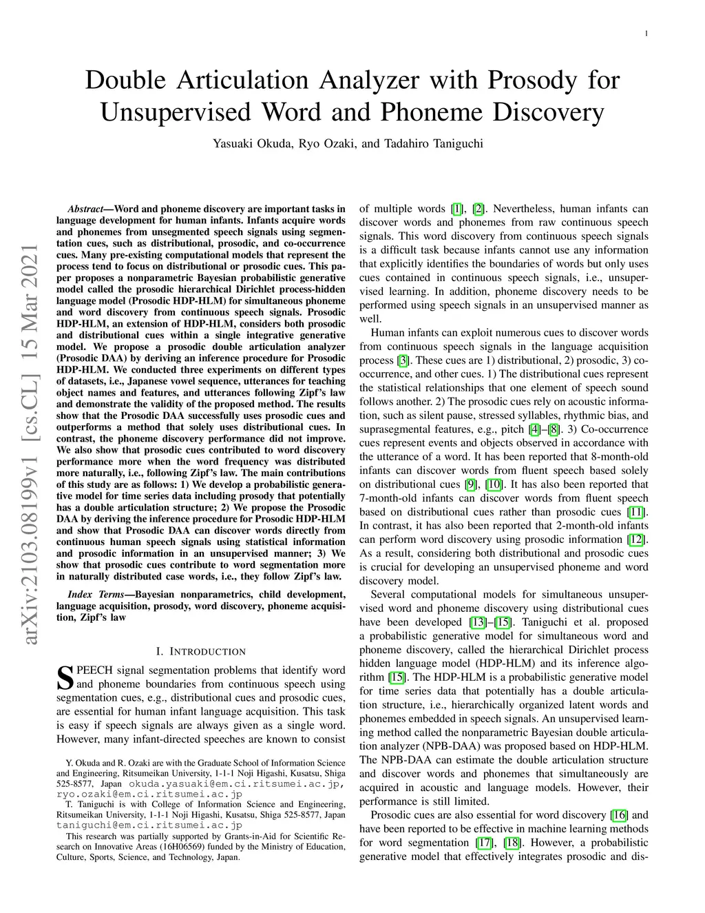 Infants acquire words and phonemes from unsegmented speech signals using segmentation cues, such as distributional, prosodic, and co-occurrence cues. Many pre-existing computational models that represent the process tend to focus on distributional or prosodic cues. This paper proposes a nonparametric Bayesian probabilistic generative model called the prosodic hierarchical Dirichlet process-hidden language model (Prosodic HDP-HLM). Prosodic HDP-HLM, an extension of HDP-HLM, considers both prosodic and distributional cues within a single integrative generative model. We conducted three experiments on different types of datasets, and demonstrate the validity of the proposed method. The results show that the Prosodic DAA successfully uses prosodic cues and outperforms a method that solely uses distributional cues. The main contributions of this study are as follows: 1) We develop a probabilistic generative model for time series data including prosody that potentially has a double articulation structure; 2) We propose the Prosodic DAA by deriving the inference procedure for Prosodic HDP-HLM and show that Prosodic DAA can discover words directly from continuous human speech signals using statistical information and prosodic information in an unsupervised manner; 3) We show that prosodic cues contribute to word segmentation more in naturally distributed case words, i.e., they follow Zipf's law.