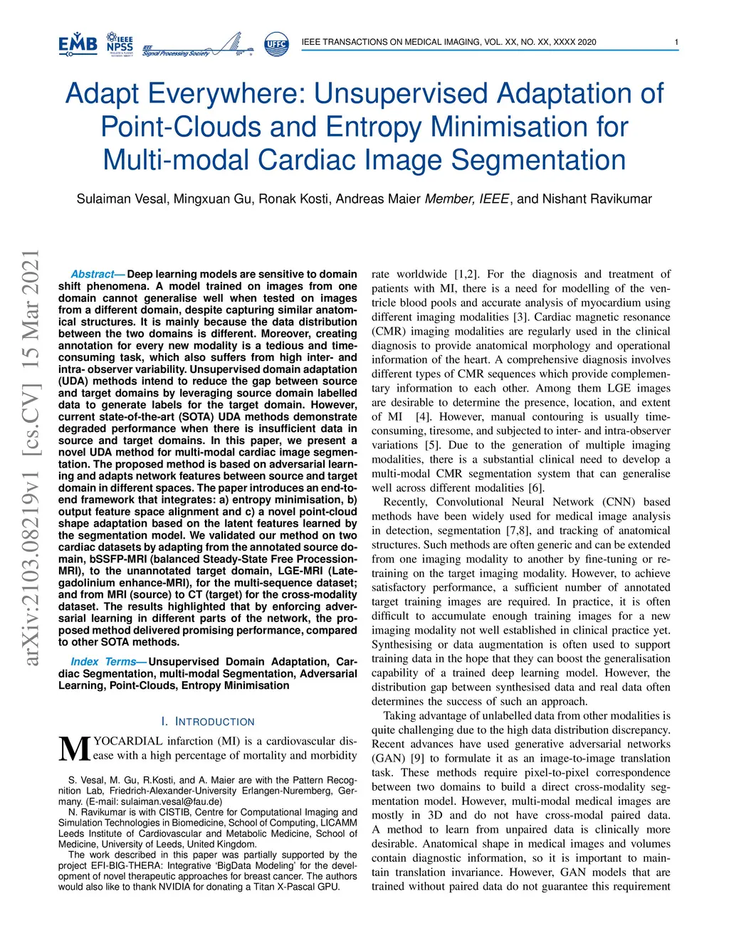 Deep learning models are sensitive to domain shift phenomena. A model trained on images from one domain cannot generalise well when tested on images from a different domain, despite capturing similar anatomical structures. It is mainly because the data distribution between the two domains is different. Moreover, creating annotation for every new modality is a tedious and time-consuming task, which also suffers from high inter- and intra- observer variability. Unsupervised domain adaptation (UDA) methods intend to reduce the gap between source and target domains by leveraging source domain labelled data to generate labels for the target domain. However, current state-of-the-art (SOTA) UDA methods demonstrate degraded performance when there is insufficient data in source and target domains. In this paper, we present a novel UDA method for multi-modal cardiac image segmentation. The proposed method is based on adversarial learning and adapts network features between source and target domain in different spaces. The paper introduces an end-to-end framework that integrates: a) entropy minimisation, b) output feature space alignment and c) a novel point-cloud shape adaptation based on the latent features learned by the segmentation model. We validated our method on two cardiac datasets by adapting from the annotated source domain, bSSFP-MRI (balanced Steady-State Free Procession-MRI), to the unannotated target domain, LGE-MRI (Late-gadolinium enhance-MRI), for the multi-sequence dataset; and from MRI (source) to CT (target) for the cross-modality dataset. The results highlighted that by enforcing adversarial learning in different parts of the network, the proposed method delivered promising performance, compared to other SOTA methods.