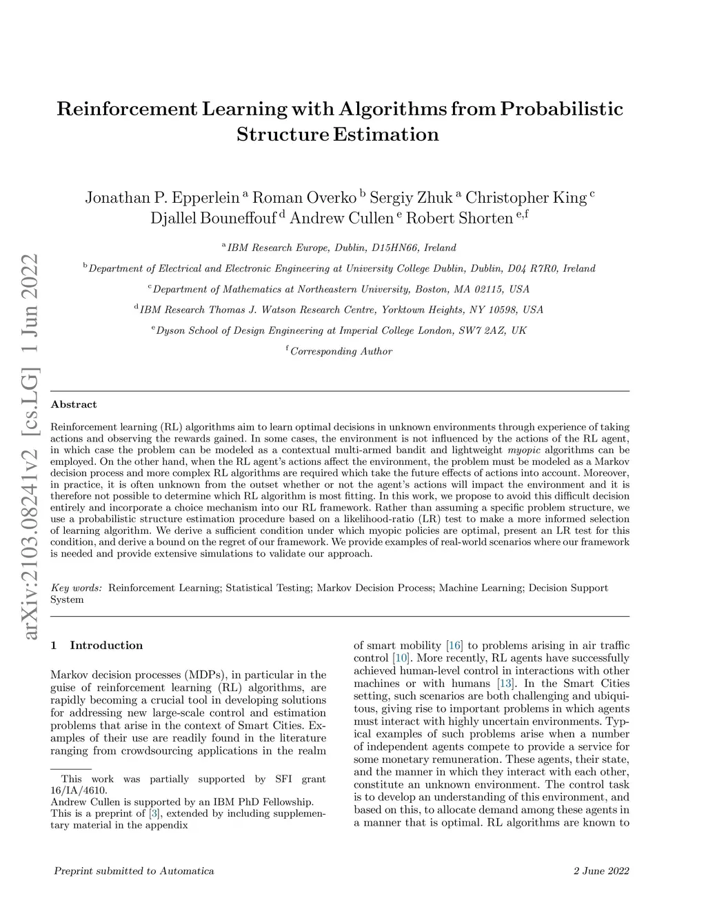 Reinforcement learning (RL) algorithms aim to learn optimal decisions in unknown environments through experience of taking actions and observing the rewards gained. In some cases, the environment is not influenced by the actions of the RL agent, in which case the problem can be modeled as a contextual multi-armed bandit and lightweight myopic algorithms can be employed. On the other hand, when the RL agent's actions affect the environment, the problem must be modeled as a Markov decision process and more complex RL algorithms are required which take the future effects of actions into account. Moreover, in practice, it is often unknown from the outset whether or not the agent's actions will impact the environment and it is therefore not possible to determine which RL algorithm is most fitting. In this work, we propose to avoid this difficult decision entirely and incorporate a choice mechanism into our RL framework. Rather than assuming a specific problem structure, we use a probabilistic structure estimation procedure based on a likelihood-ratio (LR) test to make a more informed selection of learning algorithm. We derive a sufficient condition under which myopic policies are optimal, present an LR test for this condition, and derive a bound on the regret of our framework. We provide examples of real-world scenarios where our framework is needed and provide extensive simulations to validate our approach.