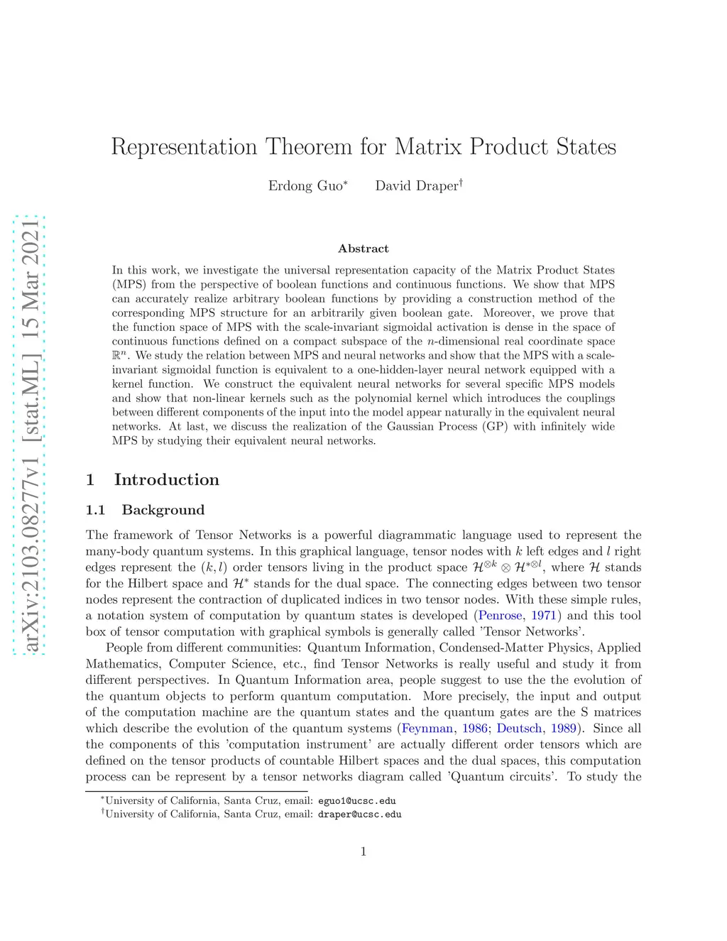 In this work, we investigate the universal representation capacity of the Matrix Product States (MPS) from the perspective of boolean functions and continuous functions. We show that MPS can accurately realize arbitrary boolean functions by providing a construction method of the corresponding MPS structure for an arbitrarily given boolean gate. Moreover, we prove that the function space of MPS with the scale-invariant sigmoidal activation is dense in the space of continuous functions defined on a compact subspace of the -dimensional real coordinate space . We study the relation between MPS and neural networks and show that the MPS with a scale-invariant sigmoidal function is equivalent to a one-hidden-layer neural network equipped with a kernel function. We construct the equivalent neural networks for several specific MPS models and show that non-linear kernels such as the polynomial kernel which introduces the couplings between different components of the input into the model appear naturally in the equivalent neural networks. At last, we discuss the realization of the Gaussian Process (GP) with infinitely wide MPS by studying their equivalent neural networks.