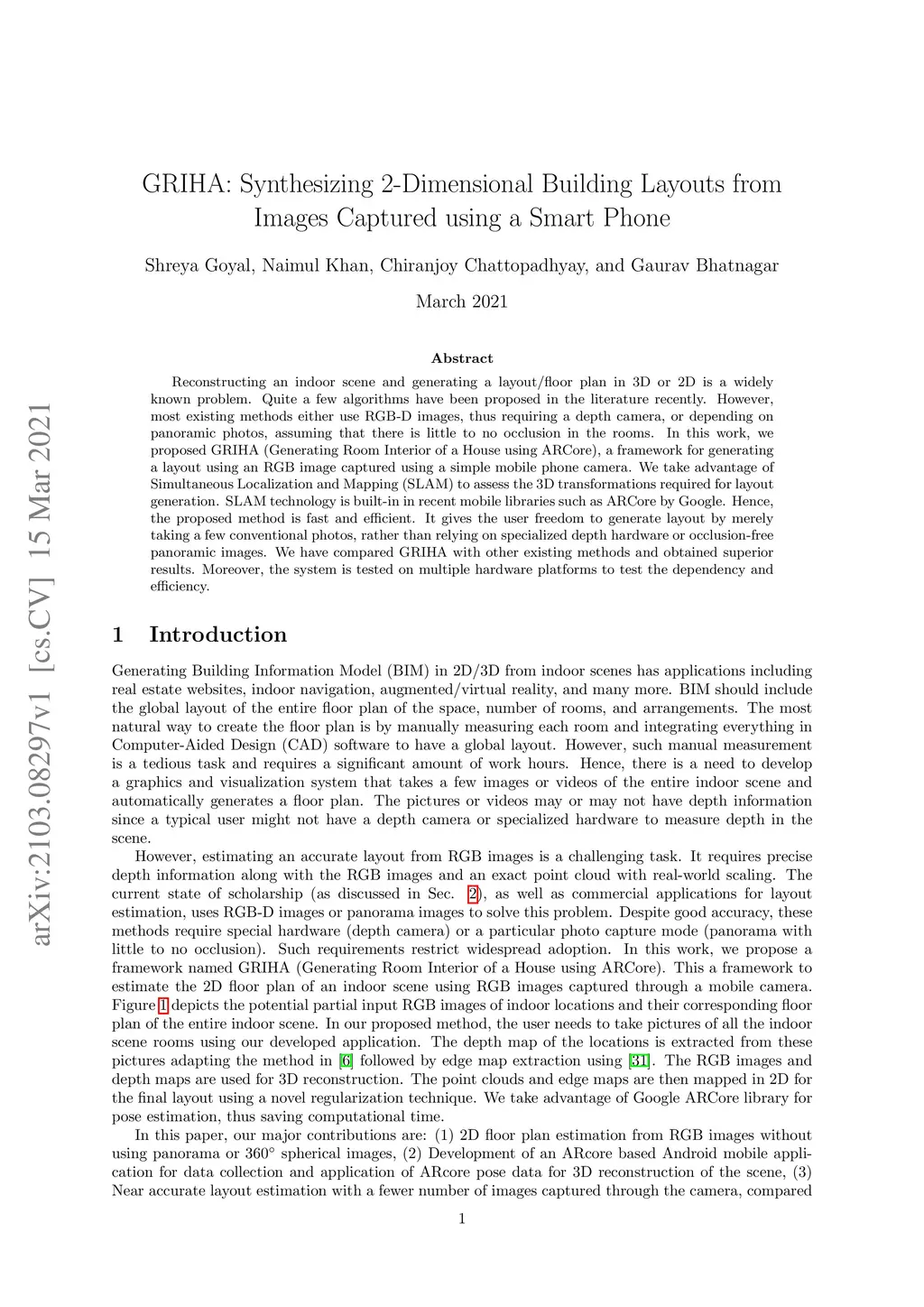 Reconstructing an indoor scene and generating a layout/floor plan in 3D or 2D is a widely known problem. Quite a few algorithms have been proposed in the literature recently. However, most existing methods either use RGB-D images, thus requiring a depth camera, or depending on panoramic photos, assuming that there is little to no occlusion in the rooms. In this work, we proposed GRIHA (Generating Room Interior of a House using ARCore), a framework for generating a layout using an RGB image captured using a simple mobile phone camera. We take advantage of Simultaneous Localization and Mapping (SLAM) to assess the 3D transformations required for layout generation. SLAM technology is built-in in recent mobile libraries such as ARCore by Google. Hence, the proposed method is fast and efficient. It gives the user freedom to generate layout by merely taking a few conventional photos, rather than relying on specialized depth hardware or occlusion-free panoramic images. We have compared GRIHA with other existing methods and obtained superior results. Also, the system is tested on multiple hardware platforms to test the dependency and efficiency.