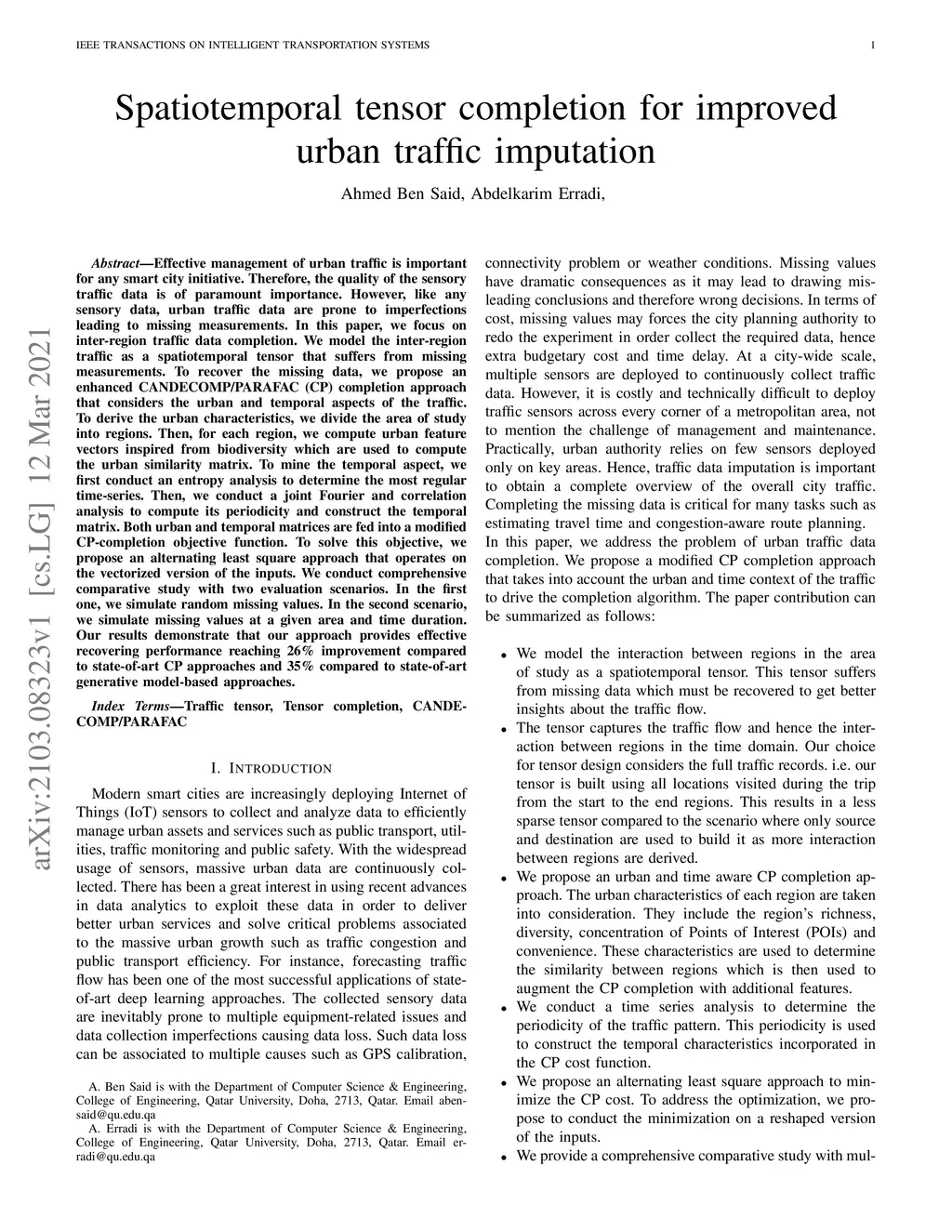 Effective management of urban traffic is important for any smart city initiative. Therefore, the quality of the sensory traffic data is of paramount importance. However, like any sensory data, urban traffic data are prone to imperfections leading to missing measurements. In this paper, we focus on inter-region traffic data completion. We model the inter-region traffic as a spatiotemporal tensor that suffers from missing measurements. To recover the missing data, we propose an enhanced CANDECOMP/PARAFAC (CP) completion approach that considers the urban and temporal aspects of the traffic. To derive the urban characteristics, we divide the area of study into regions. Then, for each region, we compute urban feature vectors inspired from biodiversity which are used to compute the urban similarity matrix. To mine the temporal aspect, we first conduct an entropy analysis to determine the most regular time-series. Then, we conduct a joint Fourier and correlation analysis to compute its periodicity and construct the temporal matrix. Both urban and temporal matrices are fed into a modified CP-completion objective function. To solve this objective, we propose an alternating least square approach that operates on the vectorized version of the inputs. We conduct comprehensive comparative study with two evaluation scenarios. In the first one, we simulate random missing values. In the second scenario, we simulate missing values at a given area and time duration. Our results demonstrate that our approach provides effective recovering performance reaching 26% improvement compared to state-of-art CP approaches and 35% compared to state-of-art generative model-based approaches.