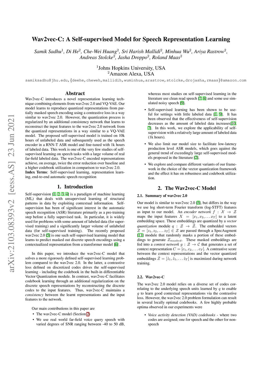 Wav2vec-C: A Self-supervised Model for Speech Representation Learning