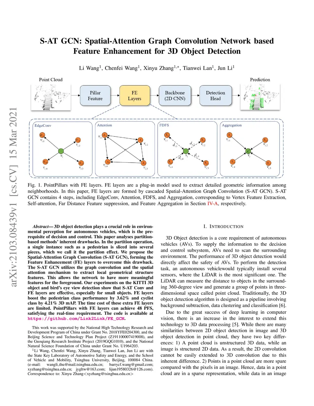 3D object detection plays a crucial role in environmental perception for autonomous vehicles, which is the prerequisite of decision and control. This paper analyses partition-based methods' inherent drawbacks. In the partition operation, a single instance such as a pedestrian is sliced into several pieces, which we call it the partition effect. We propose the Spatial-Attention Graph Convolution (S-AT GCN), forming the Feature Enhancement (FE) layers to overcome this drawback. The S-AT GCN utilizes the graph convolution and the spatial attention mechanism to extract local geometrical structure features. This allows the network to have more meaningful features for the foreground. Our experiments on the KITTI 3D object and bird's eye view detection show that S-AT Conv and FE layers are effective, especially for small objects. FE layers boost the pedestrian class performance by 3.62\% and cyclist class by 4.21\% 3D mAP. The time cost of these extra FE layers are limited. PointPillars with FE layers can achieve 48 PFS, satisfying the real-time requirement.