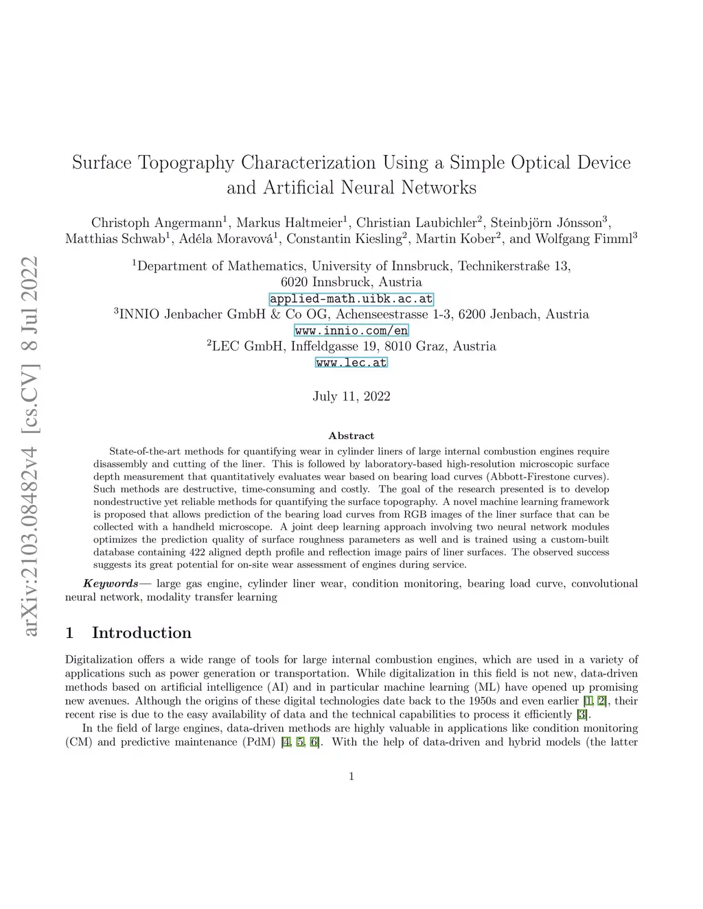 State-of-the-art methods for quantifying wear in cylinder liners of large internal combustion engines require disassembly and cutting of the liner. This is followed by laboratory-based high-resolution microscopic surface depth measurement that quantitatively evaluates wear based on bearing load curves (Abbott-Firestone curves). Such methods are destructive, time-consuming and costly. The goal of the research presented is to develop nondestructive yet reliable methods for quantifying the surface topography. A novel machine learning framework is proposed that allows prediction of the bearing load curves from RGB images of the liner surface that can be collected with a handheld microscope. A joint deep learning approach involving two neural network modules optimizes the prediction quality of surface roughness parameters as well and is trained using a custom-built database containing 422 aligned depth profile and reflection image pairs of liner surfaces. The observed success suggests its great potential for on-site wear assessment of engines during service.