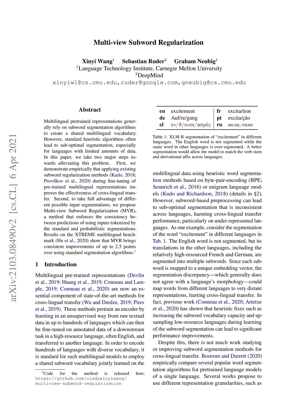 Multilingual pretrained representations generally rely on subword segmentation algorithms to create a shared multilingual vocabulary. However, standard heuristic algorithms often lead to sub-optimal segmentation, especially for languages with limited amounts of data. In this paper, we take two major steps towards alleviating this problem. First, we demonstrate empirically that applying existing subword regularization methods(Kudo, 2018; Provilkov et al., 2020) during fine-tuning of pre-trained multilingual representations improves the effectiveness of cross-lingual transfer. Second, to take full advantage of different possible input segmentations, we propose Multi-view Subword Regularization (MVR), a method that enforces the consistency between predictions of using inputs tokenized by the standard and probabilistic segmentations. Results on the XTREME multilingual benchmark(Hu et al., 2020) show that MVR brings consistent improvements of up to 2.5 points over using standard segmentation algorithms.