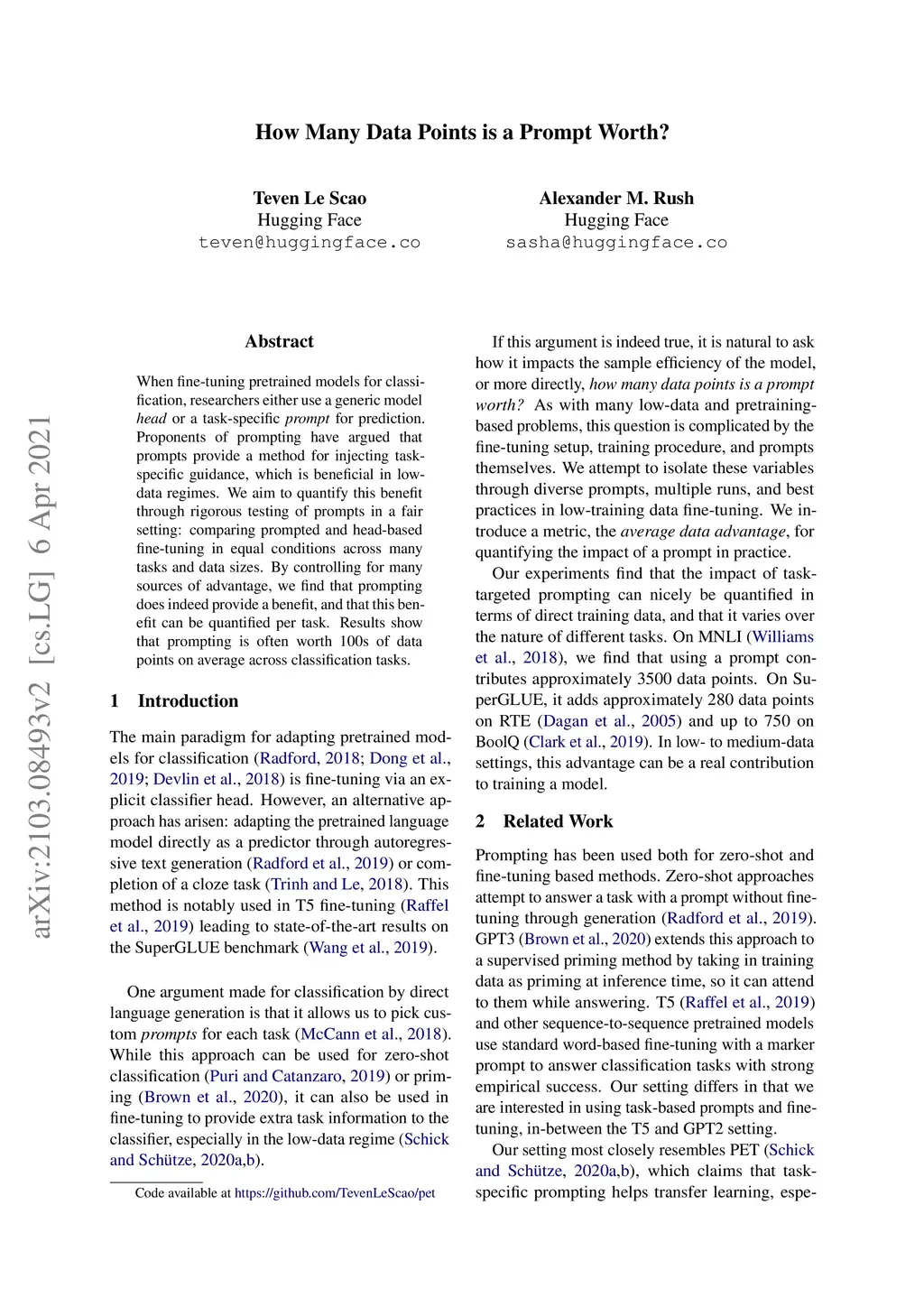 When fine-tuning pretrained models for classification, researchers either use a generic model head or a task-specific prompt for prediction. Proponents of prompting have argued that prompts provide a method for injecting task-specific guidance, which is beneficial in low-data regimes. We aim to quantify this benefit through rigorous testing of prompts in a fair setting: comparing prompted and head-based fine-tuning in equal conditions across many tasks and data sizes. By controlling for many sources of advantage, we find that prompting does indeed provide a benefit, and that this benefit can be quantified per task. Results show that prompting is often worth 100s of data points on average across classification tasks.