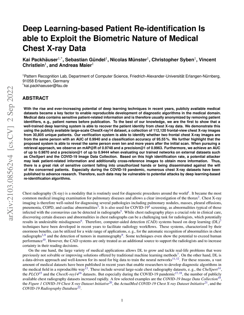 Deep Learning-based Patient Re-identification Is able to Exploit the