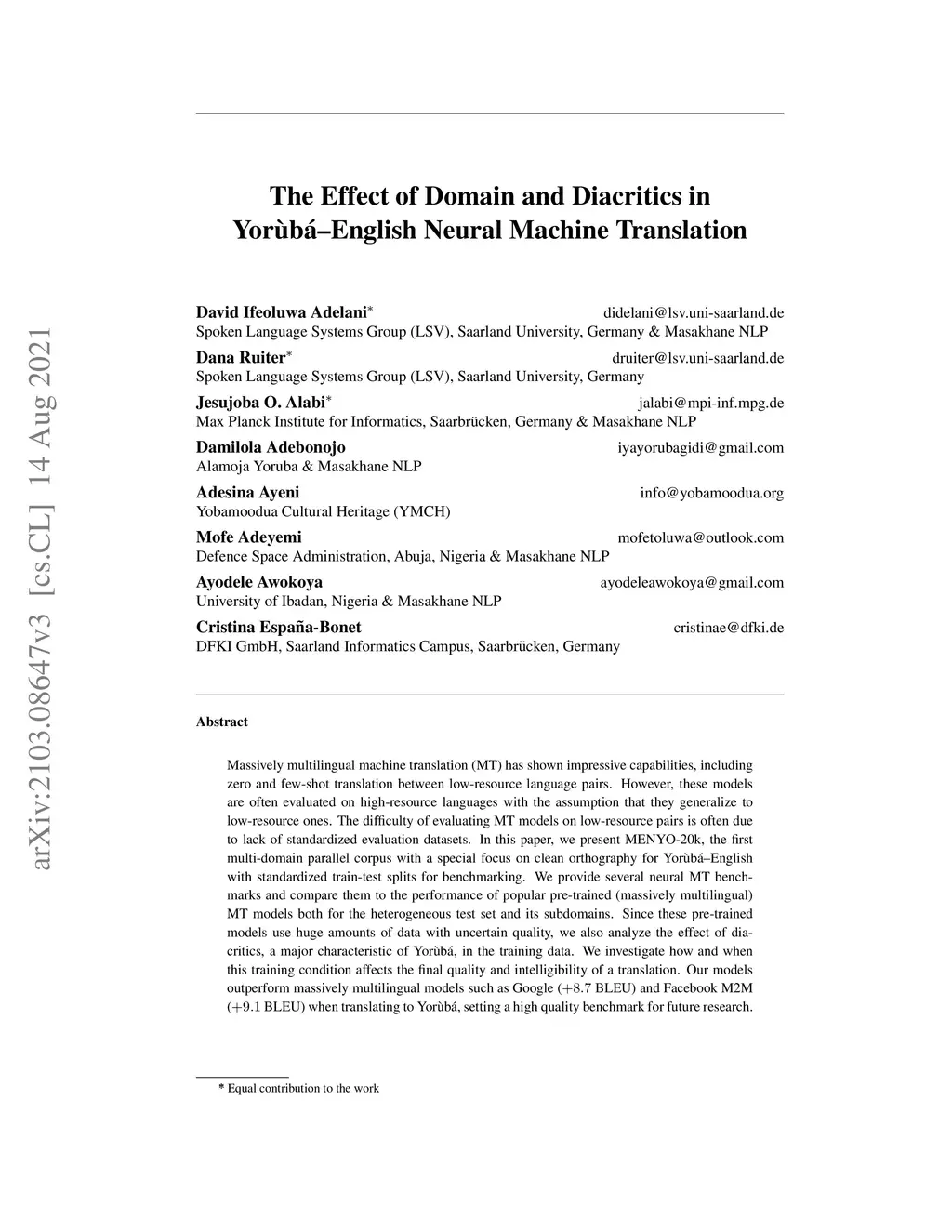 Massively multilingual machine translation (MT) has shown impressive capabilities, including zero and few-shot translation between low-resource language pairs. However, these models are often evaluated on high-resource languages with the assumption that they generalize to low-resource ones. The difficulty of evaluating MT models on low-resource pairs is often due to lack of standardized evaluation datasets. In this paper, we present MENYO-20k, the first multi-domain parallel corpus with a special focus on clean orthography for Yor\`ub\á--English with standardized train-test splits for benchmarking. We provide several neural MT benchmarks and compare them to the performance of popular pre-trained (massively multilingual) MT models both for the heterogeneous test set and its subdomains. Since these pre-trained models use huge amounts of data with uncertain quality, we also analyze the effect of diacritics, a major characteristic of Yor\`ub\á, in the training data. We investigate how and when this training condition affects the final quality and intelligibility of a translation. Our models outperform massively multilingual models such as Google ( BLEU) and Facebook M2M ( BLEU) when translating to Yor\`ub\á, setting a high quality benchmark for future research.