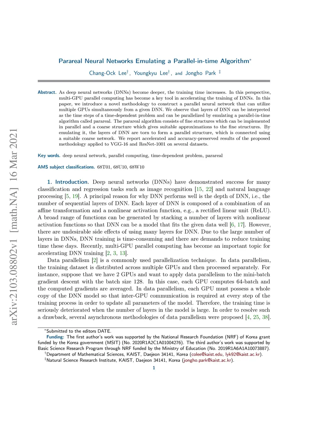 As deep neural networks (DNNs) become deeper, the training time increases. In this perspective, multi-GPU parallel computing has become a key tool in accelerating the training of DNNs. In this paper, we introduce a novel methodology to construct a parallel neural network that can utilize multiple GPUs simultaneously from a given DNN. We observe that layers of DNN can be interpreted as the time step of a time-dependent problem and can be parallelized by emulating a parallel-in-time algorithm called parareal. The parareal algorithm consists of fine structures which can be implemented in parallel and a coarse structure which gives suitable approximations to the fine structures. By emulating it, the layers of DNN are torn to form a parallel structure which is connected using a suitable coarse network. We report accelerated and accuracy-preserved results of the proposed methodology applied to VGG-16 and ResNet-1001 on several datasets.
