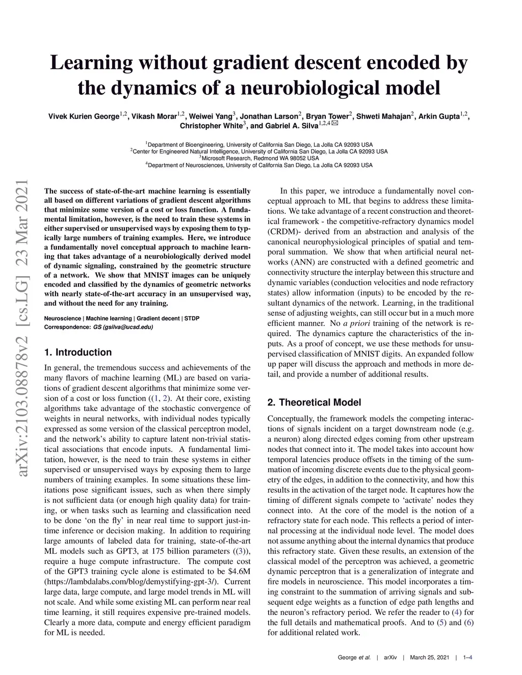 The success of state-of-the-art machine learning is essentially all based on different variations of gradient descent algorithms that minimize some version of a cost or loss function. A fundamental limitation, however, is the need to train these systems in either supervised or unsupervised ways by exposing them to typically large numbers of training examples. Here, we introduce a fundamentally novel conceptual approach to machine learning that takes advantage of a neurobiologically derived model of dynamic signaling, constrained by the geometric structure of a network. We show that MNIST images can be uniquely encoded and classified by the dynamics of geometric networks with nearly state-of-the-art accuracy in an unsupervised way, and without the need for any training.