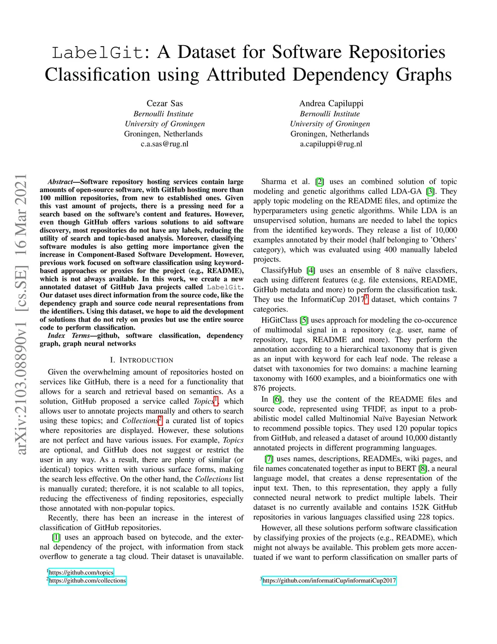 Software repository hosting services contain large amounts of open-source software, with GitHub hosting more than 100 million repositories, from new to established ones. Given this vast amount of projects, there is a pressing need for a search based on the software's content and features. However, even though GitHub offers various solutions to aid software discovery, most repositories do not have any labels, reducing the utility of search and topic-based analysis. Moreover, classifying software modules is also getting more importance given the increase in Component-Based Software Development. However, previous work focused on software classification using keyword-based approaches or proxies for the project (e.g., README), which is not always available. In this work, we create a new annotated dataset of GitHub Java projects called LabelGit. Our dataset uses direct information from the source code, like the dependency graph and source code neural representations from the identifiers. Using this dataset, we hope to aid the development of solutions that do not rely on proxies but use the entire source code to perform classification.
