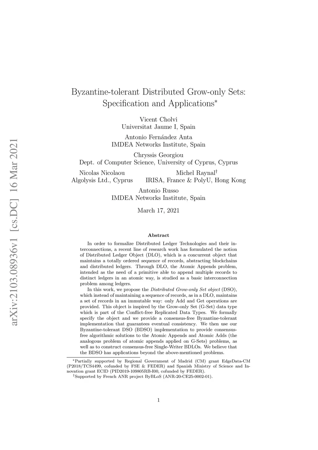 In order to formalize Distributed Ledger Technologies and their interconnections, a recent line of research work has formulated the notion of Distributed Ledger Object (DLO), which is a concurrent object that maintains a totally ordered sequence of records, abstracting blockchains and distributed ledgers. Through DLO, the Atomic Appends problem, intended as the need of a primitive able to append multiple records to distinct ledgers in an atomic way, is studied as a basic interconnection problem among ledgers. In this work, we propose the Distributed Grow-only Set object (DSO), which instead of maintaining a sequence of records, as in a DLO, maintains a set of records in an immutable way: only Add and Get operations are provided. This object is inspired by the Grow-only Set (G-Set) data type which is part of the Conflict-free Replicated Data Types. We formally specify the object and we provide a consensus-free Byzantine-tolerant implementation that guarantees eventual consistency. We then use our Byzantine-tolerant DSO (BDSO) implementation to provide consensus-free algorithmic solutions to the Atomic Appends and Atomic Adds (the analogous problem of atomic appends applied on G-Sets) problems, as well as to construct consensus-free Single-Writer BDLOs. We believe that the BDSO has applications beyond the above-mentioned problems.
