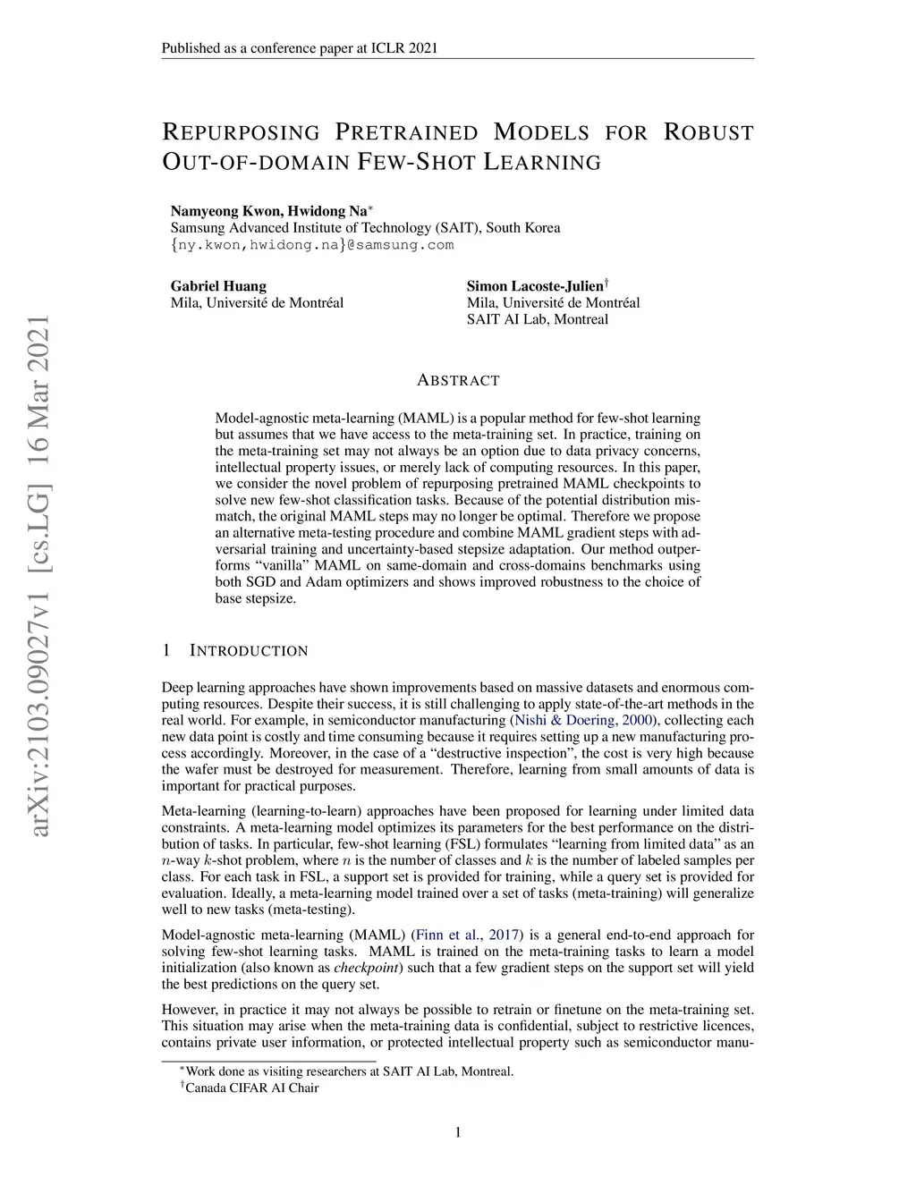 Model-agnostic meta-learning (MAML) is a popular method for few-shot learning but assumes that we have access to the meta-training set. In practice, training on the meta-training set may not always be an option due to data privacy concerns, intellectual property issues, or merely lack of computing resources. In this paper, we consider the novel problem of repurposing pretrained MAML checkpoints to solve new few-shot classification tasks. Because of the potential distribution mismatch, the original MAML steps may no longer be optimal. Therefore we propose an alternative meta-testing procedure and combine MAML gradient steps with adversarial training and uncertainty-based stepsize adaptation. Our method outperforms "vanilla" MAML on same-domain and cross-domains benchmarks using both SGD and Adam optimizers and shows improved robustness to the choice of base stepsize.
