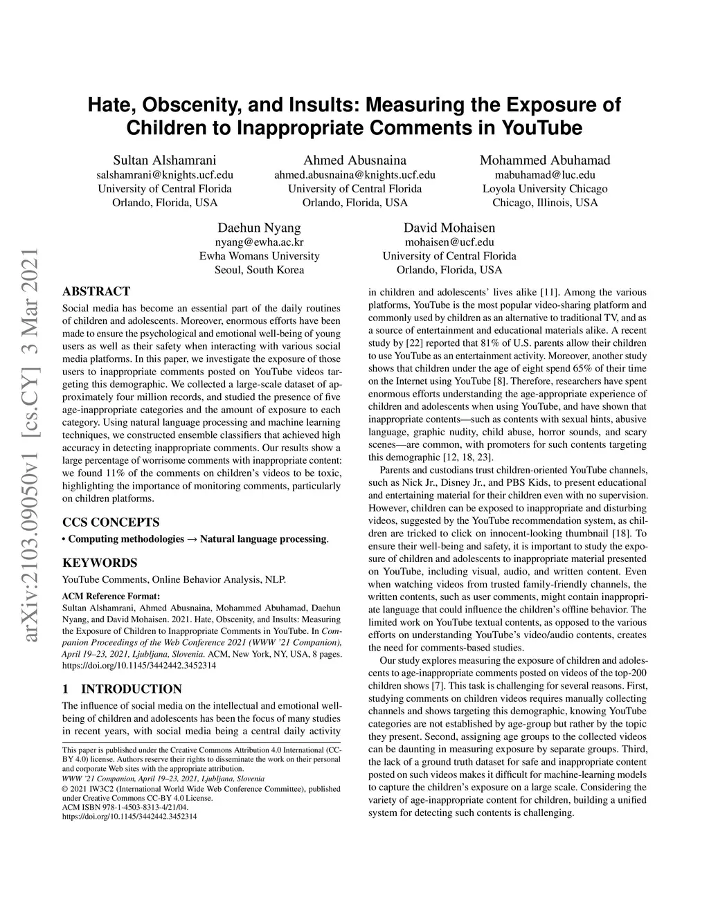 Social media has become an essential part of the daily routines of children and adolescents. Moreover, enormous efforts have been made to ensure the psychological and emotional well-being of young users as well as their safety when interacting with various social media platforms. In this paper, we investigate the exposure of those users to inappropriate comments posted on YouTube videos targeting this demographic. We collected a large-scale dataset of approximately four million records and studied the presence of five age-inappropriate categories and the amount of exposure to each category. Using natural language processing and machine learning techniques, we constructed ensemble classifiers that achieved high accuracy in detecting inappropriate comments. Our results show a large percentage of worrisome comments with inappropriate content: we found 11% of the comments on children's videos to be toxic, highlighting the importance of monitoring comments, particularly on children's platforms.