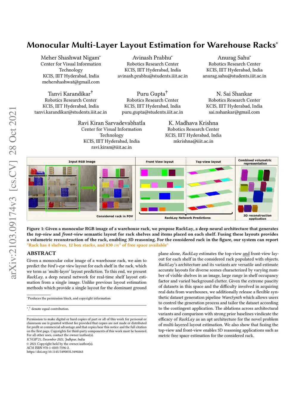 Given a monocular colour image of a warehouse rack, we aim to predict the bird's-eye view layout for each shelf in the rack, which we term as multi-layer layout prediction. To this end, we present RackLay, a deep neural network for real-time shelf layout estimation from a single image. Unlike previous layout estimation methods, which provide a single layout for the dominant ground plane alone, RackLay estimates the top-view and front-view layout for each shelf in the considered rack populated with objects. RackLay's architecture and its variants are versatile and estimate accurate layouts for diverse scenes characterized by varying number of visible shelves in an image, large range in shelf occupancy factor and varied background clutter. Given the extreme paucity of datasets in this space and the difficulty involved in acquiring real data from warehouses, we additionally release a flexible synthetic dataset generation pipeline WareSynth which allows users to control the generation process and tailor the dataset according to contingent application. The ablations across architectural variants and comparison with strong prior baselines vindicate the efficacy of RackLay as an apt architecture for the novel problem of multi-layered layout estimation. We also show that fusing the top-view and front-view enables 3D reasoning applications such as metric free space estimation for the considered rack.