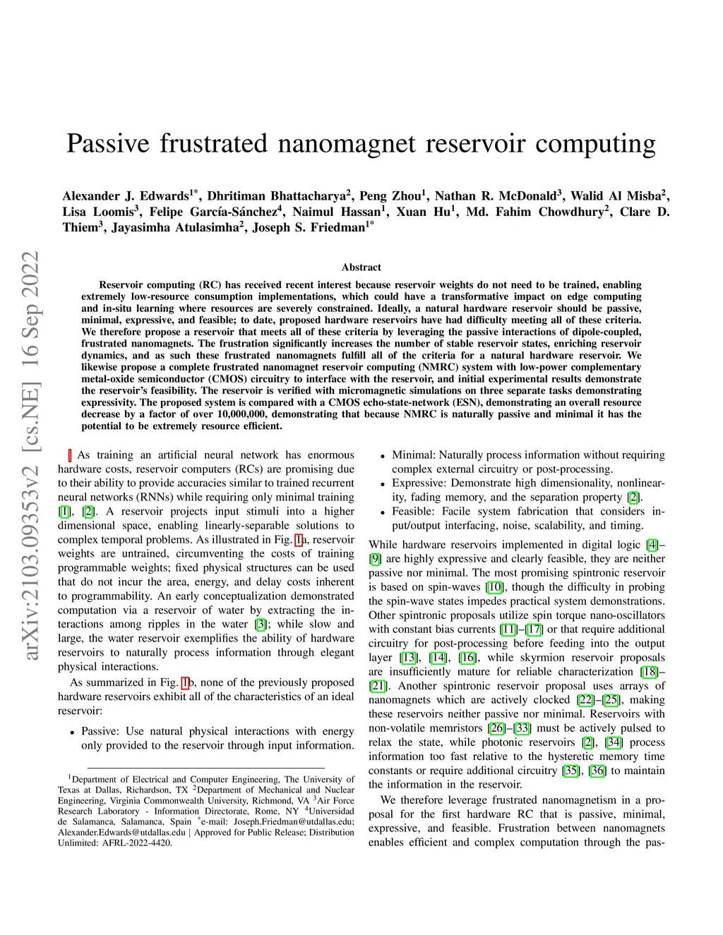 Reservoir computing (RC) has received recent interest because reservoir weights do not need to be trained, enabling extremely low-resource consumption implementations, which could have a transformative impact on edge computing and in-situ learning where resources are severely constrained. Ideally, a natural hardware reservoir should be passive, minimal, expressive, and feasible; to date, proposed hardware reservoirs have had difficulty meeting all of these criteria. We therefore propose a reservoir that meets all of these criteria by leveraging the passive interactions of dipole-coupled, frustrated nanomagnets. The frustration significantly increases the number of stable reservoir states, enriching reservoir dynamics, and as such these frustrated nanomagnets fulfill all of the criteria for a natural hardware reservoir. We likewise propose a complete frustrated nanomagnet reservoir computing (NMRC) system with low-power complementary metal-oxide semiconductor (CMOS) circuitry to interface with the reservoir, and initial experimental results demonstrate the reservoir's feasibility. The reservoir is verified with micromagnetic simulations on three separate tasks demonstrating expressivity. The proposed system is compared with a CMOS echo-state-network (ESN), demonstrating an overall resource decrease by a factor of over 10,000,000, demonstrating that because NMRC is naturally passive and minimal it has the potential to be extremely resource efficient.