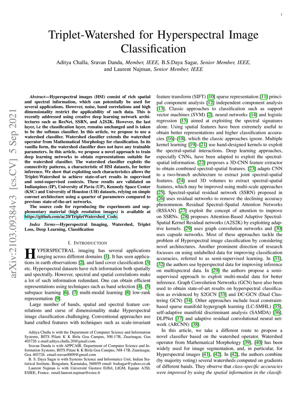 Triplet-Watershed for Hyperspectral Image Classification