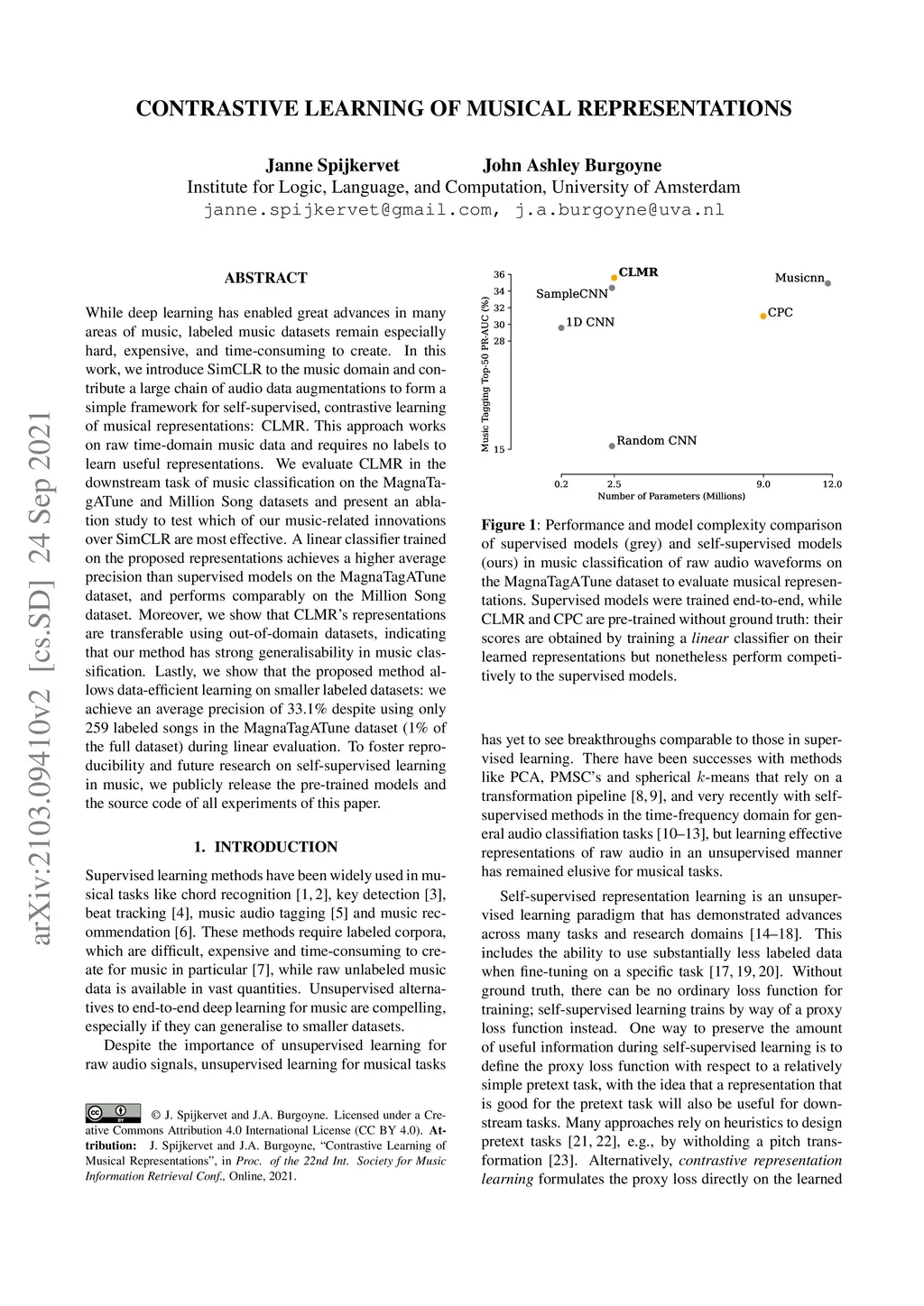 While deep learning has enabled great advances in many areas of music, labeled music datasets remain especially hard, expensive, and time-consuming to create. In this work, we introduce SimCLR to the music domain and contribute a large chain of audio data augmentations to form a simple framework for self-supervised, contrastive learning of musical representations: CLMR. This approach works on raw time-domain music data and requires no labels to learn useful representations. We evaluate CLMR in the downstream task of music classification on the MagnaTagATune and Million Song datasets and present an ablation study to test which of our music-related innovations over SimCLR are most effective. A linear classifier trained on the proposed representations achieves a higher average precision than supervised models on the MagnaTagATune dataset, and performs comparably on the Million Song dataset. Moreover, we show that CLMR's representations are transferable using out-of-domain datasets, indicating that our method has strong generalisability in music classification. Lastly, we show that the proposed method allows data-efficient learning on smaller labeled datasets: we achieve an average precision of 33.1% despite using only 259 labeled songs in the MagnaTagATune dataset (1% of the full dataset) during linear evaluation. To foster reproducibility and future research on self-supervised learning in music, we publicly release the pre-trained models and the source code of all experiments of this paper.