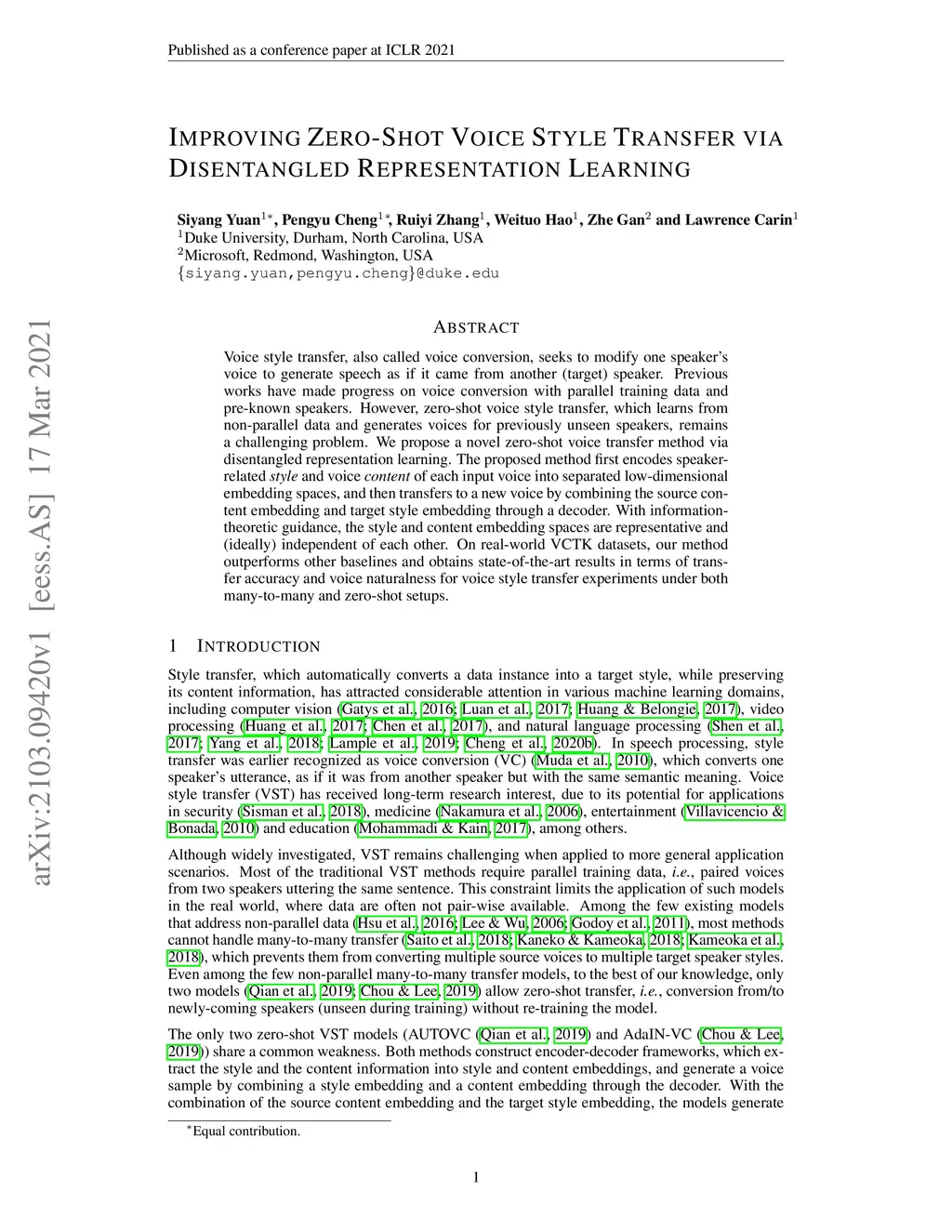 Voice style transfer, also called voice conversion, seeks to modify one speaker's voice to generate speech as if it came from another (target) speaker. Previous works have made progress on voice conversion with parallel training data and pre-known speakers. However, zero-shot voice style transfer, which learns from non-parallel data and generates voices for previously unseen speakers, remains a challenging problem. We propose a novel zero-shot voice transfer method via disentangled representation learning. The proposed method first encodes speaker-related style and voice content of each input voice into separated low-dimensional embedding spaces, and then transfers to a new voice by combining the source content embedding and target style embedding through a decoder. With information-theoretic guidance, the style and content embedding spaces are representative and (ideally) independent of each other. On real-world VCTK datasets, our method outperforms other baselines and obtains state-of-the-art results in terms of transfer accuracy and voice naturalness for voice style transfer experiments under both many-to-many and zero-shot setups.