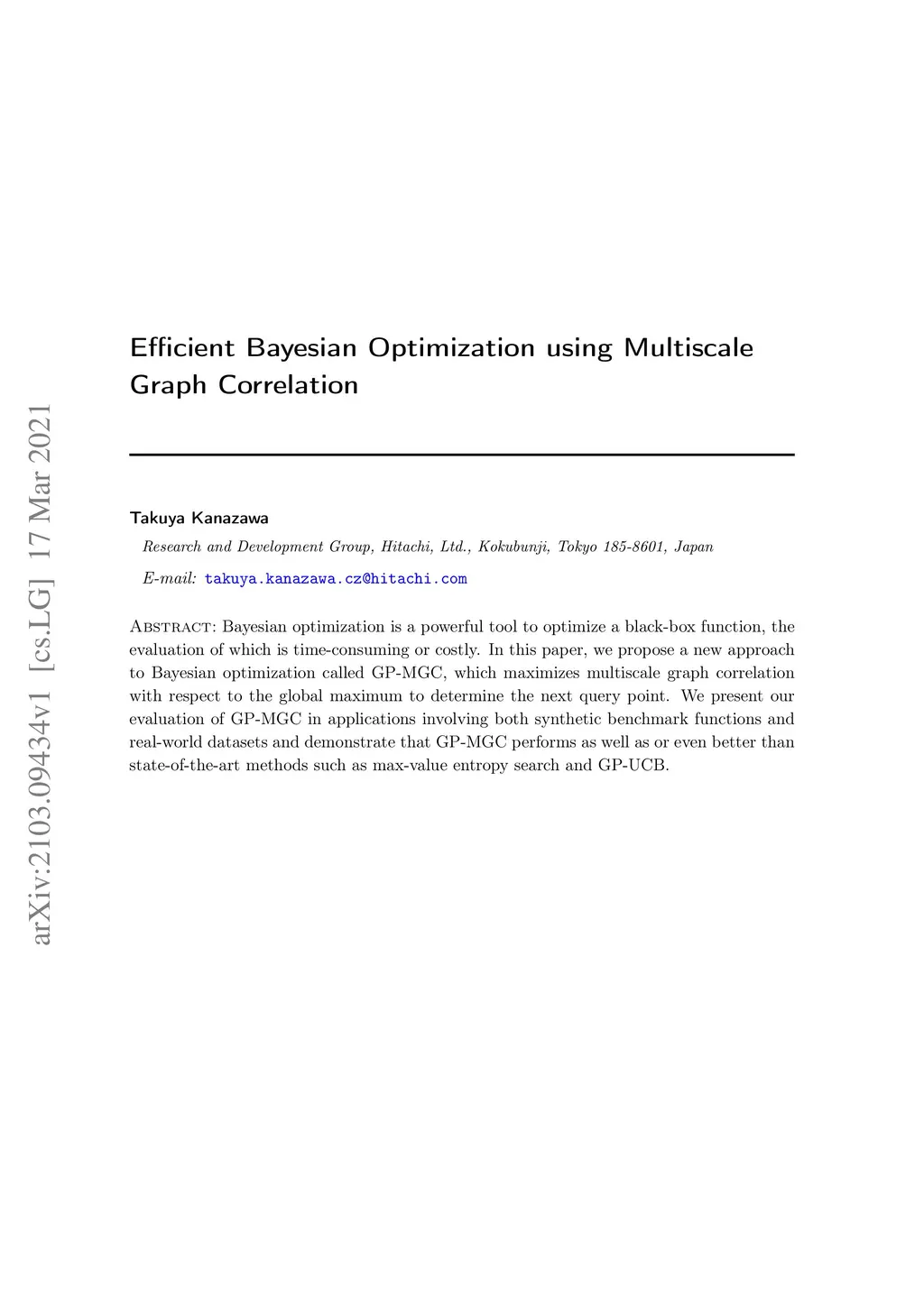 Bayesian optimization is a powerful tool to optimize a black-box function, the evaluation of which is time-consuming or costly. In this paper, we propose a new approach to Bayesian optimization called GP-MGC, which maximizes multiscale graph correlation with respect to the global maximum to determine the next query point. We present our evaluation of GP-MGC in applications involving both synthetic benchmark functions and real-world datasets and demonstrate that GP-MGC performs as well as or even better than state-of-the-art methods such as max-value entropy search and GP-UCB.