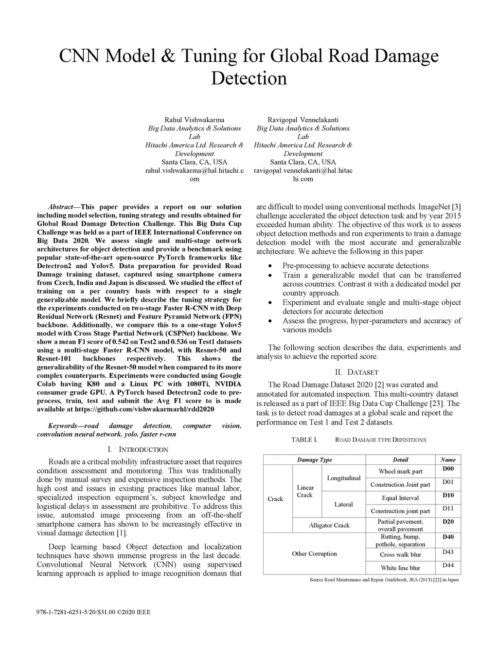This paper provides a report on our solution including model selection, tuning strategy and results obtained for Global Road Damage Detection Challenge. This Big Data Cup Challenge was held as a part of IEEE International Conference on Big Data 2020. We assess single and multi-stage network architectures for object detection and provide a benchmark using popular state-of-the-art open-source PyTorch frameworks like Detectron2 and Yolov5. Data preparation for provided Road Damage training dataset, captured using smartphone camera from Czech, India and Japan is discussed. We studied the effect of training on a per country basis with respect to a single generalizable model. We briefly describe the tuning strategy for the experiments conducted on two-stage Faster R-CNN with Deep Residual Network (Resnet) and Feature Pyramid Network (FPN) backbone. Additionally, we compare this to a one-stage Yolov5 model with Cross Stage Partial Network (CSPNet) backbone. We show a mean F1 score of 0.542 on Test2 and 0.536 on Test1 datasets using a multi-stage Faster R-CNN model, with Resnet-50 and Resnet-101 backbones respectively. This shows the generalizability of the Resnet-50 model when compared to its more complex counterparts. Experiments were conducted using Google Colab having K80 and a Linux PC with 1080Ti, NVIDIA consumer grade GPU. A PyTorch based Detectron2 code to preprocess, train, test and submit the Avg F1 score to is made available at https://github.com/vishwakarmarhl/rdd2020