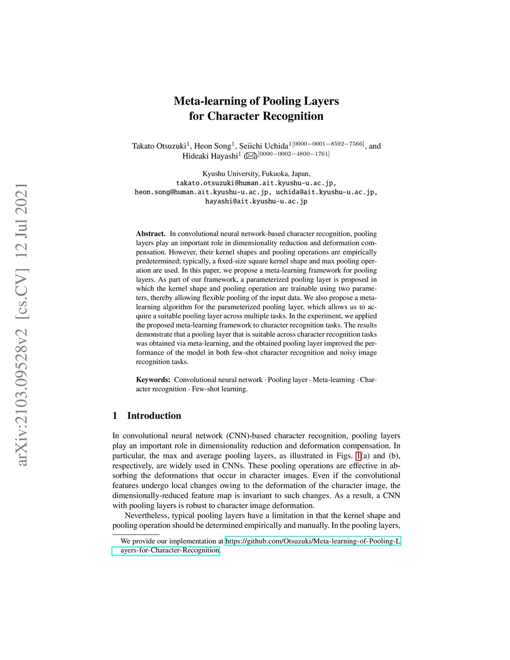 In convolutional neural network-based character recognition, pooling layers play an important role in dimensionality reduction and deformation compensation. However, their kernel shapes and pooling operations are empirically predetermined; typically, a fixed-size square kernel shape and max pooling operation are used. In this paper, we propose a meta-learning framework for pooling layers. As part of our framework, a parameterized pooling layer is proposed in which the kernel shape and pooling operation are trainable using two parameters, thereby allowing flexible pooling of the input data. We also propose a meta-learning algorithm for the parameterized pooling layer, which allows us to acquire a suitable pooling layer across multiple tasks. In the experiment, we applied the proposed meta-learning framework to character recognition tasks. The results demonstrate that a pooling layer that is suitable across character recognition tasks was obtained via meta-learning, and the obtained pooling layer improved the performance of the model in both few-shot character recognition and noisy image recognition tasks.