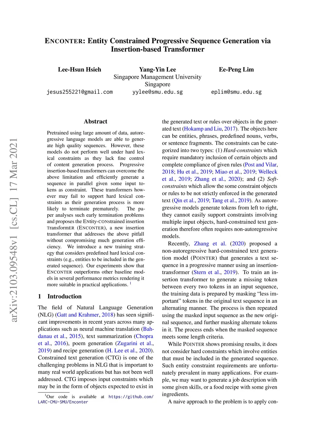 Pretrained using large amount of data, autoregressive language models are able to generate high quality sequences. However, these models do not perform well under hard lexical constraints as they lack fine control of content generation process. Progressive insertion-based transformers can overcome the above limitation and efficiently generate a sequence in parallel given some input tokens as constraint. These transformers however may fail to support hard lexical constraints as their generation process is more likely to terminate prematurely. The paper analyses such early termination problems and proposes the Entity-constrained insertion transformer (ENCONTER), a new insertion transformer that addresses the above pitfall without compromising much generation efficiency. We introduce a new training strategy that considers predefined hard lexical constraints (e.g., entities to be included in the generated sequence). Our experiments show that ENCONTER outperforms other baseline models in several performance metrics rendering it more suitable in practical applications. Our code is available at https://github.com/LARC-CMU-SMU/Enconter