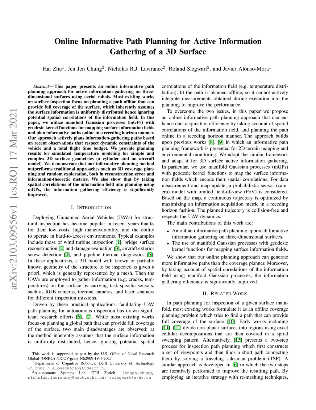 This paper presents an online informative path planning approach for active information gathering on three-dimensional surfaces using aerial robots. Most existing works on surface inspection focus on planning a path offline that can provide full coverage of the surface, which inherently assumes the surface information is uniformly distributed hence ignoring potential spatial correlations of the information field. In this paper, we utilize manifold Gaussian processes (mGPs) with geodesic kernel functions for mapping surface information fields and plan informative paths online in a receding horizon manner. Our approach actively plans information-gathering paths based on recent observations that respect dynamic constraints of the vehicle and a total flight time budget. We provide planning results for simulated temperature modeling for simple and complex 3D surface geometries (a cylinder and an aircraft model). We demonstrate that our informative planning method outperforms traditional approaches such as 3D coverage planning and random exploration, both in reconstruction error and information-theoretic metrics. We also show that by taking spatial correlations of the information field into planning using mGPs, the information gathering efficiency is significantly improved.