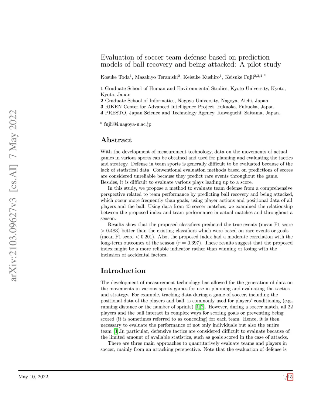 With the development of measurement technology, data on the movements of actual games in various sports can be obtained and used for planning and evaluating the tactics and strategy. Defense in team sports is generally difficult to be evaluated because of the lack of statistical data. Conventional evaluation methods based on predictions of scores are considered unreliable because they predict rare events throughout the game. Besides, it is difficult to evaluate various plays leading up to a score. In this study, we propose a method to evaluate team defense from a comprehensive perspective related to team performance by predicting ball recovery and being attacked, which occur more frequently than goals, using player actions and positional data of all players and the ball. Using data from 45 soccer matches, we examined the relationship between the proposed index and team performance in actual matches and throughout a season. Results show that the proposed classifiers predicted the true events (mean F1 score 0.483) better than the existing classifiers which were based on rare events or goals (mean F1 score 0.201). Also, the proposed index had a moderate correlation with the long-term outcomes of the season ( 0.397). These results suggest that the proposed index might be a more reliable indicator rather than winning or losing with the inclusion of accidental factors.