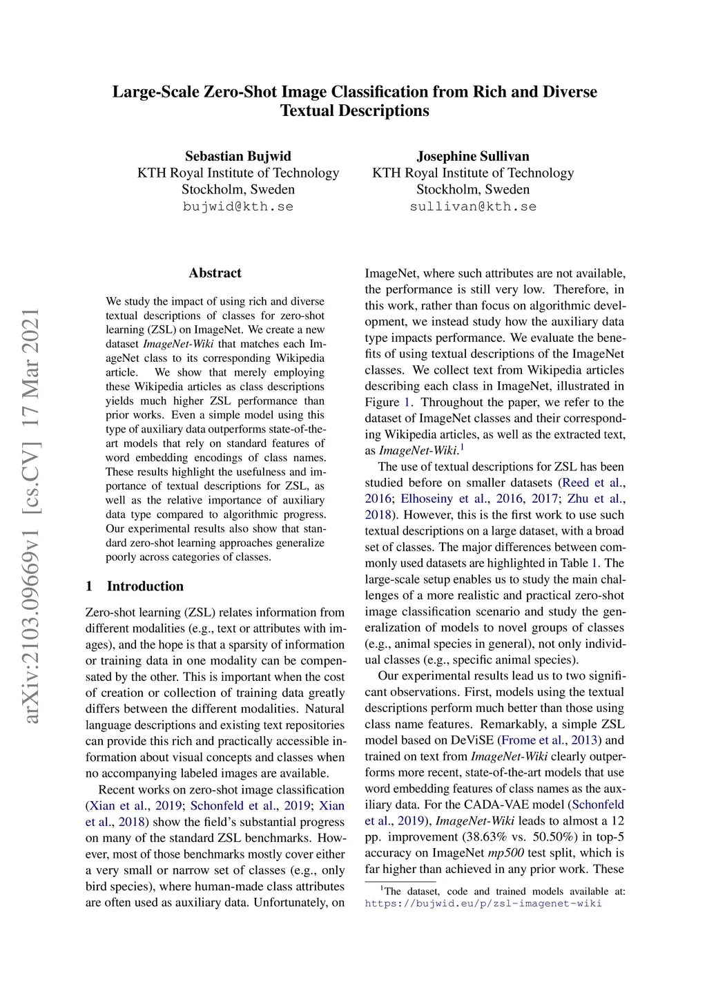 We study the impact of using rich and diverse textual descriptions of classes for zero-shot learning (ZSL) on ImageNet. We create a new dataset ImageNet-Wiki that matches each ImageNet class to its corresponding Wikipedia article. We show that merely employing these Wikipedia articles as class descriptions yields much higher ZSL performance than prior works. Even a simple model using this type of auxiliary data outperforms state-of-the-art models that rely on standard features of word embedding encodings of class names. These results highlight the usefulness and importance of textual descriptions for ZSL, as well as the relative importance of auxiliary data type compared to algorithmic progress. Our experimental results also show that standard zero-shot learning approaches generalize poorly across categories of classes.