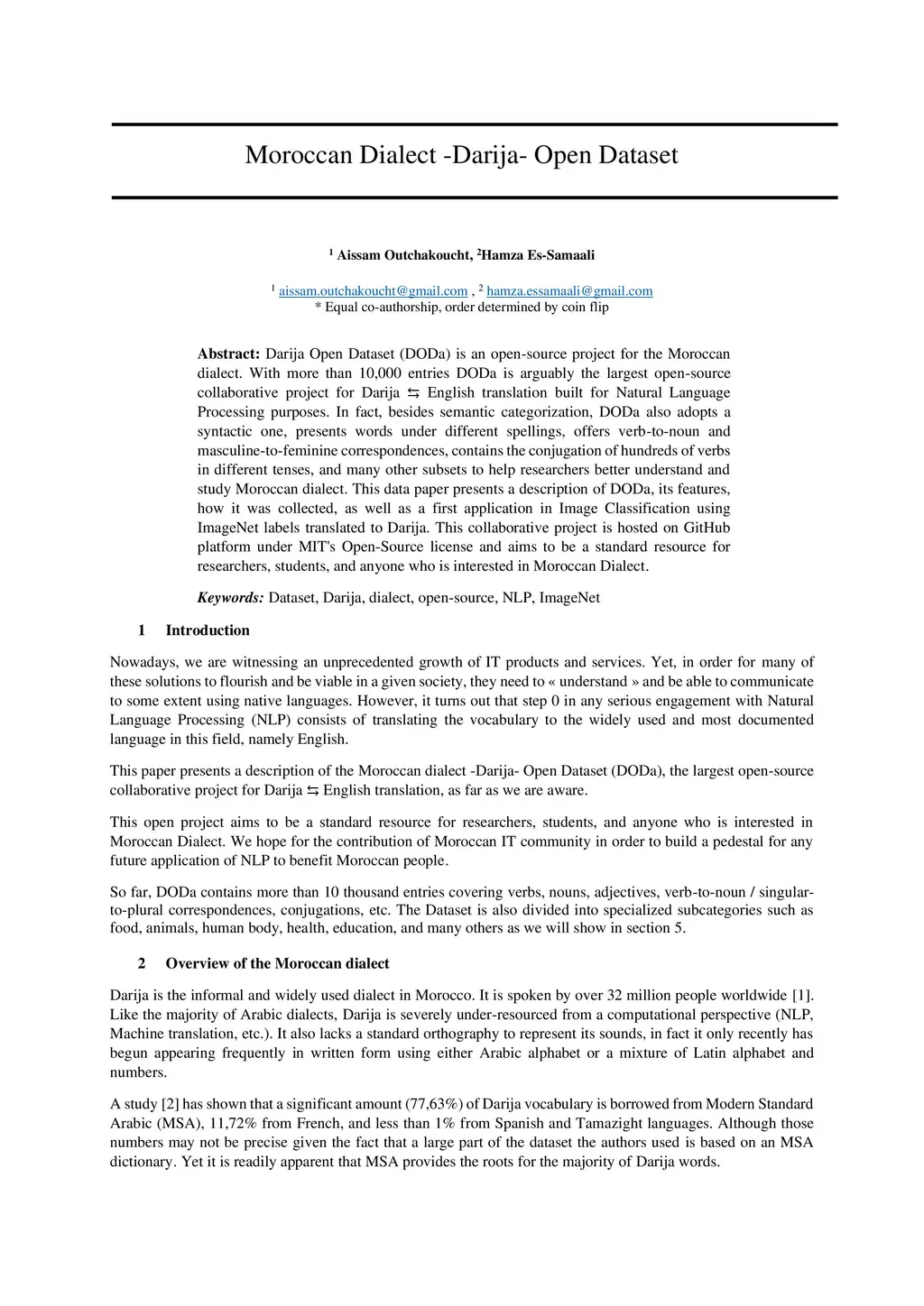 Darija Open Dataset (DODa) is an open-source project for the Moroccan dialect. With more than 10,000 entries DODa is arguably the largest open-source collaborative project for Darija-English translation built for Natural Language Processing purposes. In fact, besides semantic categorization, DODa also adopts a syntactic one, presents words under different spellings, offers verb-to-noun and masculine-to-feminine correspondences, contains the conjugation of hundreds of verbs in different tenses, and many other subsets to help researchers better understand and study Moroccan dialect. This data paper presents a description of DODa, its features, how it was collected, as well as a first application in Image Classification using ImageNet labels translated to Darija. This collaborative project is hosted on GitHub platform under MIT's Open-Source license and aims to be a standard resource for researchers, students, and anyone who is interested in Moroccan Dialect