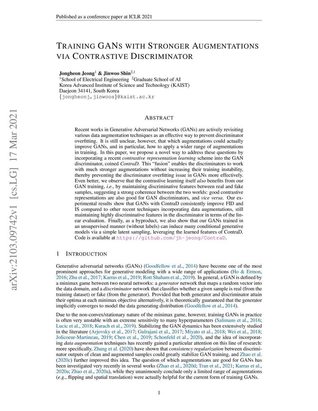 Recent works in Generative Adversarial Networks (GANs) are actively revisiting various data augmentation techniques as an effective way to prevent discriminator overfitting. It is still unclear, however, that which augmentations could actually improve GANs, and in particular, how to apply a wider range of augmentations in training. In this paper, we propose a novel way to address these questions by incorporating a recent contrastive representation learning scheme into the GAN discriminator, coined ContraD. This "fusion" enables the discriminators to work with much stronger augmentations without increasing their training instability, thereby preventing the discriminator overfitting issue in GANs more effectively. Even better, we observe that the contrastive learning itself also benefits from our GAN training, i.e., by maintaining discriminative features between real and fake samples, suggesting a strong coherence between the two worlds: good contrastive representations are also good for GAN discriminators, and vice versa. Our experimental results show that GANs with ContraD consistently improve FID and IS compared to other recent techniques incorporating data augmentations, still maintaining highly discriminative features in the discriminator in terms of the linear evaluation. Finally, as a byproduct, we also show that our GANs trained in an unsupervised manner (without labels) can induce many conditional generative models via a simple latent sampling, leveraging the learned features of ContraD. Code is available at https://github.com/jh-jeong/ContraD.