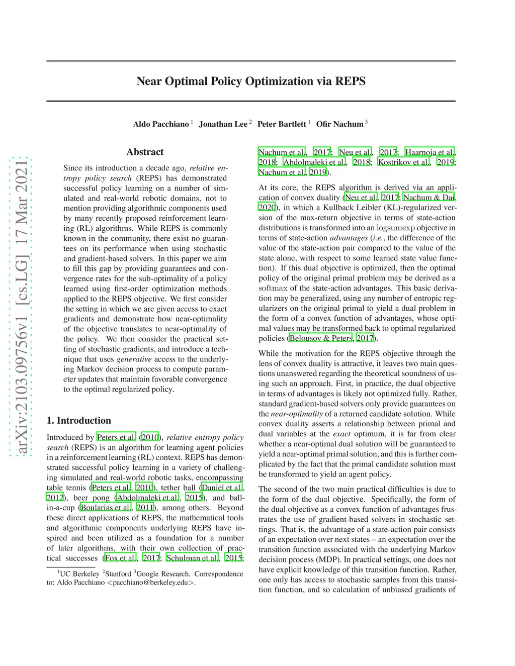 Since its introduction a decade ago, \emph{relative entropy policy search} (REPS) has demonstrated successful policy learning on a number of simulated and real-world robotic domains, not to mention providing algorithmic components used by many recently proposed reinforcement learning (RL) algorithms. While REPS is commonly known in the community, there exist no guarantees on its performance when using stochastic and gradient-based solvers. In this paper we aim to fill this gap by providing guarantees and convergence rates for the sub-optimality of a policy learned using first-order optimization methods applied to the REPS objective. We first consider the setting in which we are given access to exact gradients and demonstrate how near-optimality of the objective translates to near-optimality of the policy. We then consider the practical setting of stochastic gradients, and introduce a technique that uses \emph{generative} access to the underlying Markov decision process to compute parameter updates that maintain favorable convergence to the optimal regularized policy.