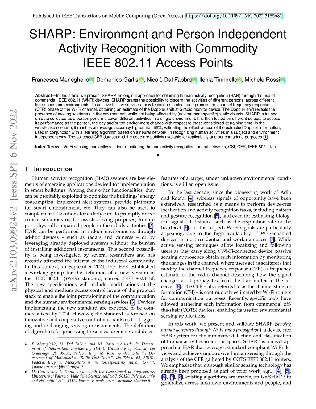 In this article we present SHARP, an original approach for obtaining human activity recognition (HAR) through the use of commercial IEEE 802.11 (Wi-Fi) devices. SHARP grants the possibility to discern the activities of different persons, across different time-spans and environments. To achieve this, we devise a new technique to clean and process the channel frequency response (CFR) phase of the Wi-Fi channel, obtaining an estimate of the Doppler shift at a radio monitor device. The Doppler shift reveals the presence of moving scatterers in the environment, while not being affected by (environment-specific) static objects. SHARP is trained on data collected as a person performs seven different activities in a single environment. It is then tested on different setups, to assess its performance as the person, the day and/or the environment change with respect to those considered at training time. In the worst-case scenario, it reaches an average accuracy higher than 95%, validating the effectiveness of the extracted Doppler information, used in conjunction with a learning algorithm based on a neural network, in recognizing human activities in a subject and environment independent way. The collected CFR dataset and the code are publicly available for replicability and benchmarking purposes.