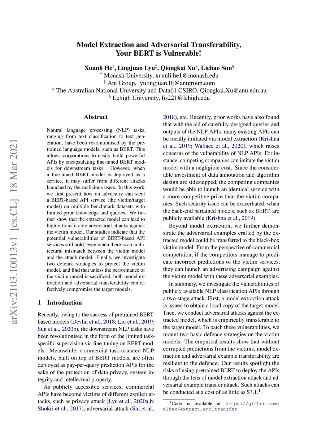 Model Extraction and Adversarial Transferability, Your BERT is