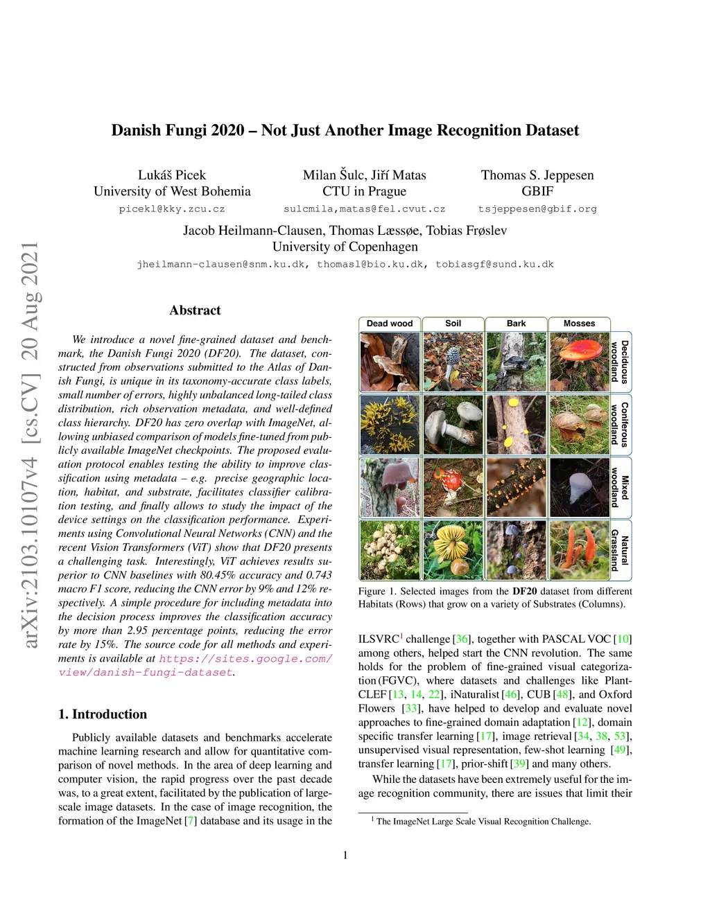 We introduce a novel fine-grained dataset and benchmark, the Danish Fungi 2020 (DF20). The dataset, constructed from observations submitted to the Danish Fungal Atlas, is unique in its taxonomy-accurate class labels, small number of errors, highly unbalanced long-tailed class distribution, rich observation metadata, and well-defined class hierarchy. DF20 has zero overlap with ImageNet, allowing unbiased comparison of models fine-tuned from publicly available ImageNet checkpoints. The proposed evaluation protocol enables testing the ability to improve classification using metadata -- e.g. precise geographic location, habitat, and substrate, facilitates classifier calibration testing, and finally allows to study the impact of the device settings on the classification performance. Experiments using Convolutional Neural Networks (CNN) and the recent Vision Transformers (ViT) show that DF20 presents a challenging task. Interestingly, ViT achieves results superior to CNN baselines with 81.25% accuracy, reducing the CNN error by 13%. A baseline procedure for including metadata into the decision process improves the classification accuracy by more than 3.5 percentage points, reducing the error rate by 20%. The source code for all methods and experiments is available at https://sites.google.com/view/danish-fungi-dataset.