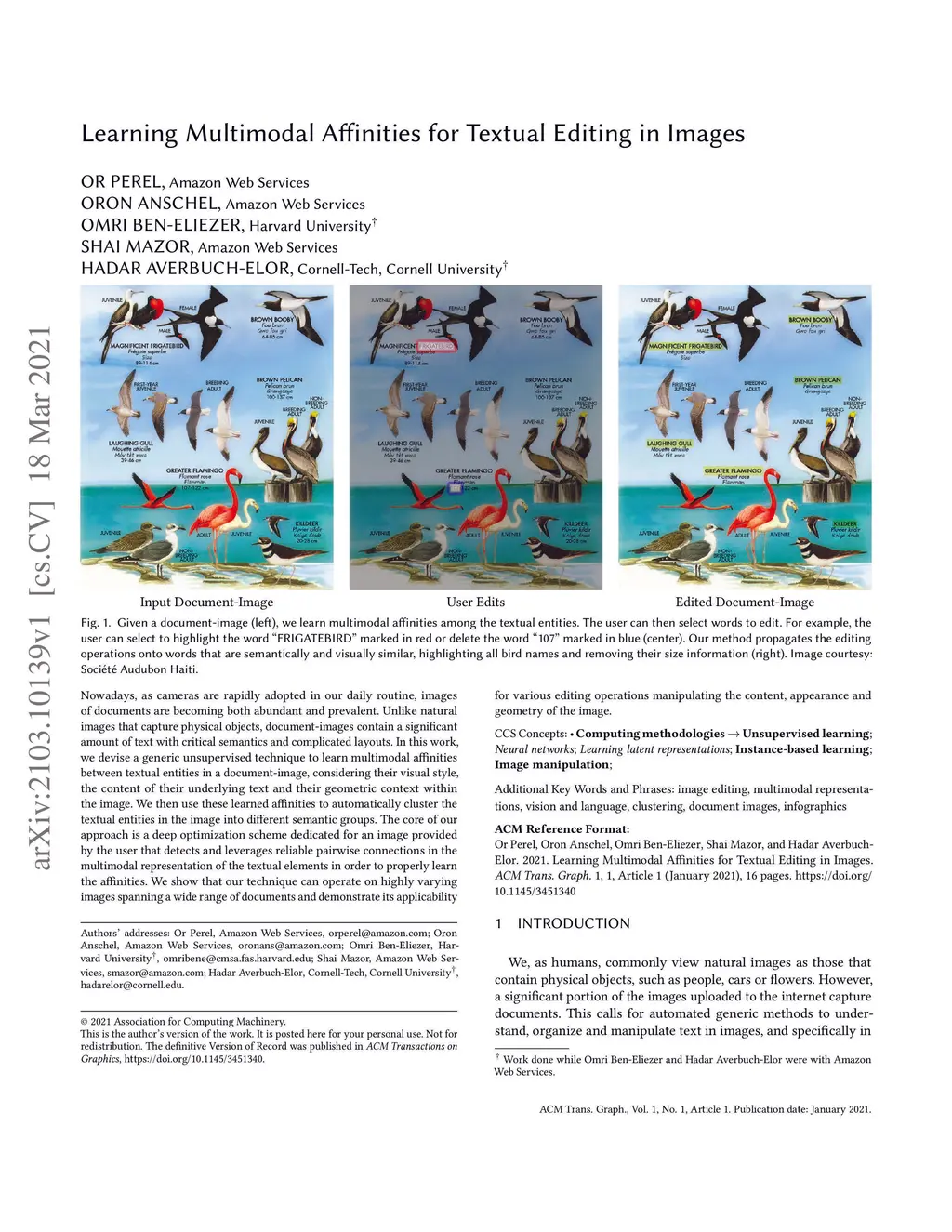 Nowadays, as cameras are rapidly adopted in our daily routine, images of documents are becoming both abundant and prevalent. Unlike natural images that capture physical objects, document-images contain a significant amount of text with critical semantics and complicated layouts. In this work, we devise a generic unsupervised technique to learn multimodal affinities between textual entities in a document-image, considering their visual style, the content of their underlying text and their geometric context within the image. We then use these learned affinities to automatically cluster the textual entities in the image into different semantic groups. The core of our approach is a deep optimization scheme dedicated for an image provided by the user that detects and leverages reliable pairwise connections in the multimodal representation of the textual elements in order to properly learn the affinities. We show that our technique can operate on highly varying images spanning a wide range of documents and demonstrate its applicability for various editing operations manipulating the content, appearance and geometry of the image.