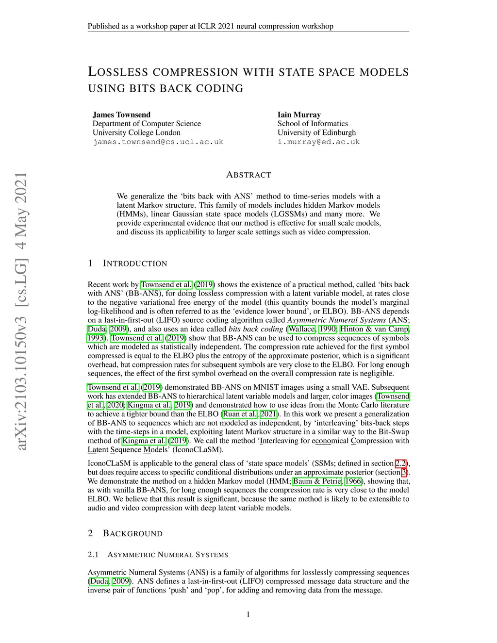 We generalize the 'bits back with ANS' method to time-series models with a latent Markov structure. This family of models includes hidden Markov models (HMMs), linear Gaussian state space models (LGSSMs) and many more. We provide experimental evidence that our method is effective for small scale models, and discuss its applicability to larger scale settings such as video compression.