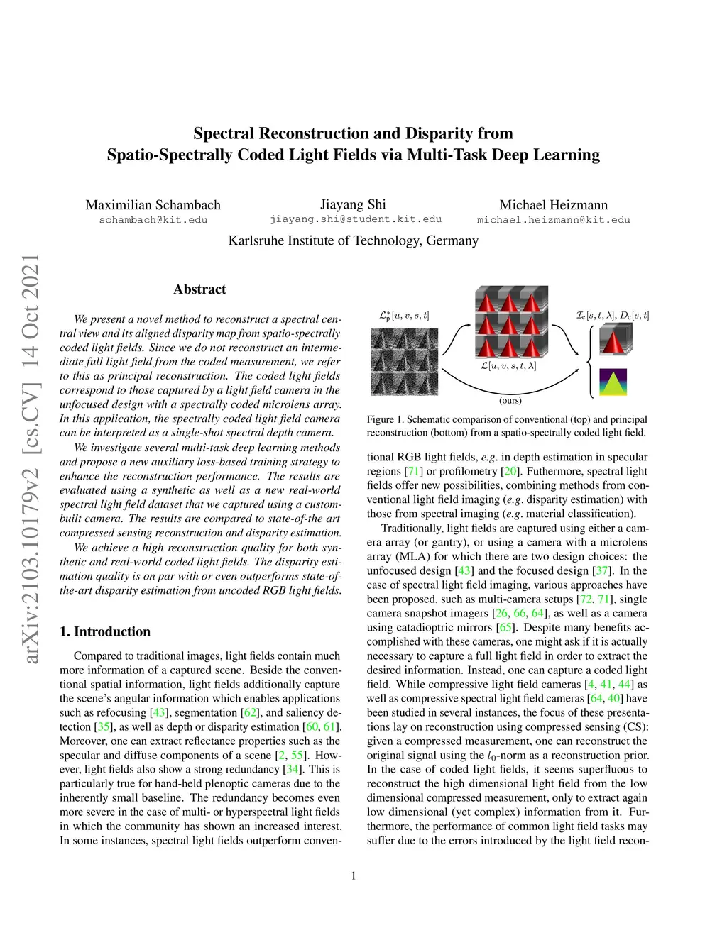 We present a novel method to reconstruct a spectral central view and its aligned disparity map from spatio-spectrally coded light fields. Since we do not reconstruct an intermediate full light field from the coded measurement, we refer to this as principal reconstruction. The coded light fields correspond to those captured by a light field camera in the unfocused design with a spectrally coded microlens array. In this application, the spectrally coded light field camera can be interpreted as a single-shot spectral depth camera. We investigate several multi-task deep learning methods and propose a new auxiliary loss-based training strategy to enhance the reconstruction performance. The results are evaluated using a synthetic as well as a new real-world spectral light field dataset that we captured using a custom-built camera. The results are compared to state-of-the art compressed sensing reconstruction and disparity estimation. We achieve a high reconstruction quality for both synthetic and real-world coded light fields. The disparity estimation quality is on par with or even outperforms state-of-the-art disparity estimation from uncoded RGB light fields.