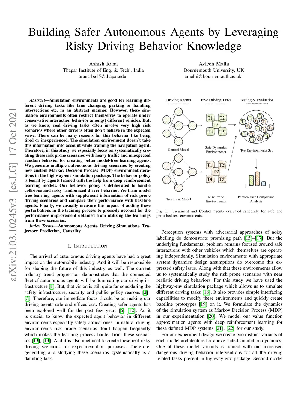 Simulation environments are good for learning different driving tasks like lane changing, parking or handling intersections etc. in an abstract manner. However, these simulation environments often restrict themselves to operate under conservative interaction behavior amongst different vehicles. But, as we know, real driving tasks often involve very high risk scenarios where other drivers often don't behave in the expected sense. There can be many reasons for this behavior like being tired or inexperienced. The simulation environment doesn't take this information into account while training the navigation agent. Therefore, in this study we especially focus on systematically creating these risk prone scenarios with heavy traffic and unexpected random behavior for creating better model-free learning agents. We generate multiple autonomous driving scenarios by creating new custom Markov Decision Process (MDP) environment iterations in the highway-env simulation package. The behavior policy is learnt by agents trained with the help from deep reinforcement learning models. Our behavior policy is deliberated to handle collisions and risky randomized driver behavior. We train model free learning agents with supplement information of risk prone driving scenarios and compare their performance with baseline agents. Finally, we casually measure the impact of adding these perturbations in the training process to precisely account for the performance improvement obtained from utilizing the learnings from these scenarios.